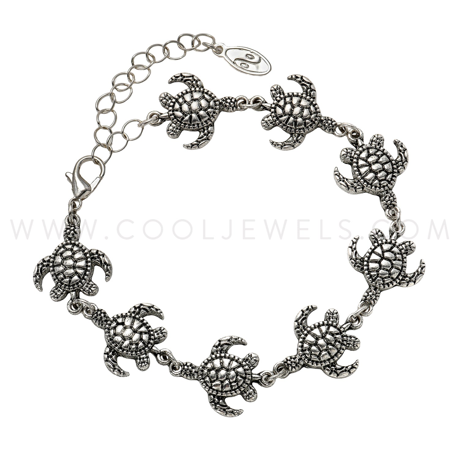 These Silver Turtle Bracelets feature a pattern of silver turtles on a chain bracelet.