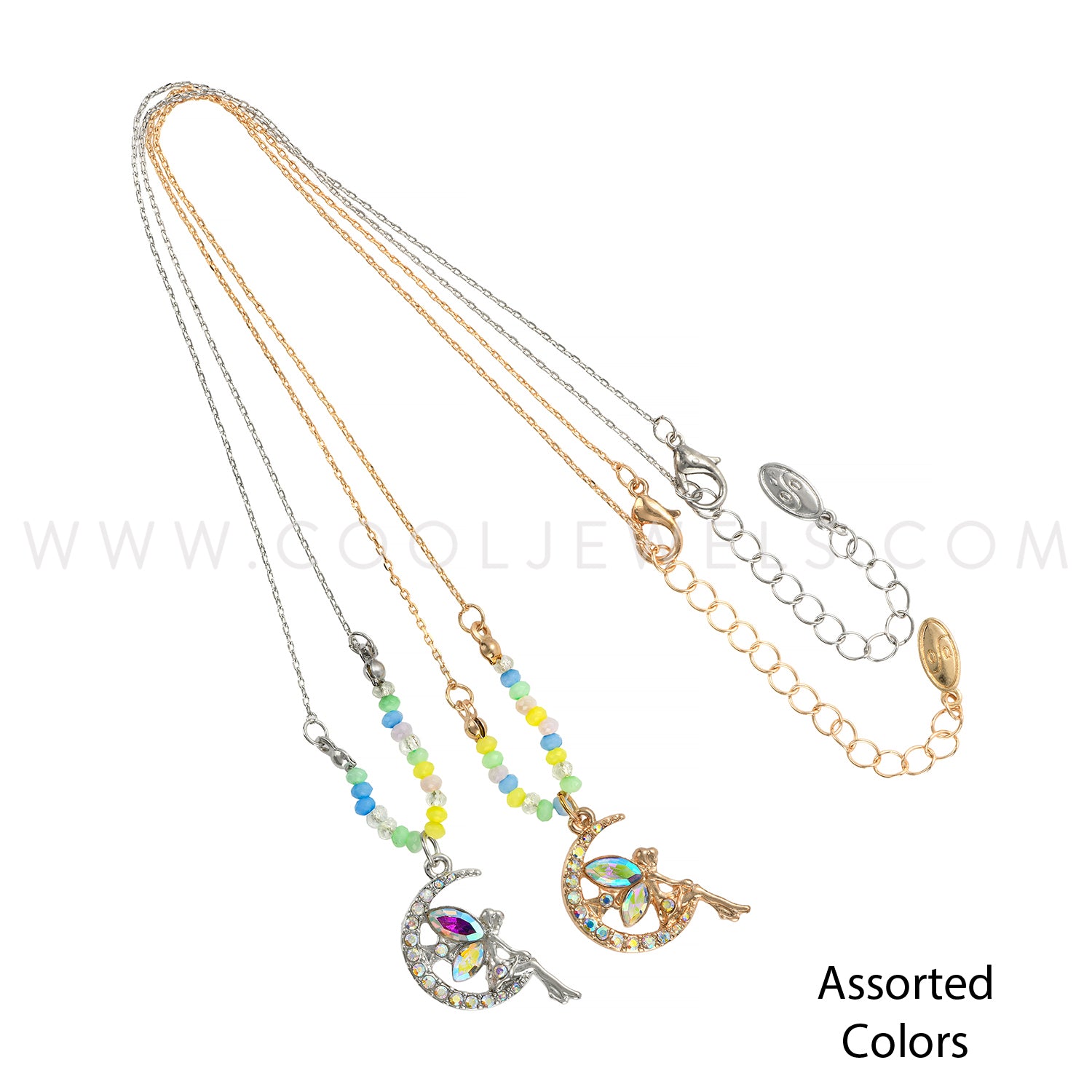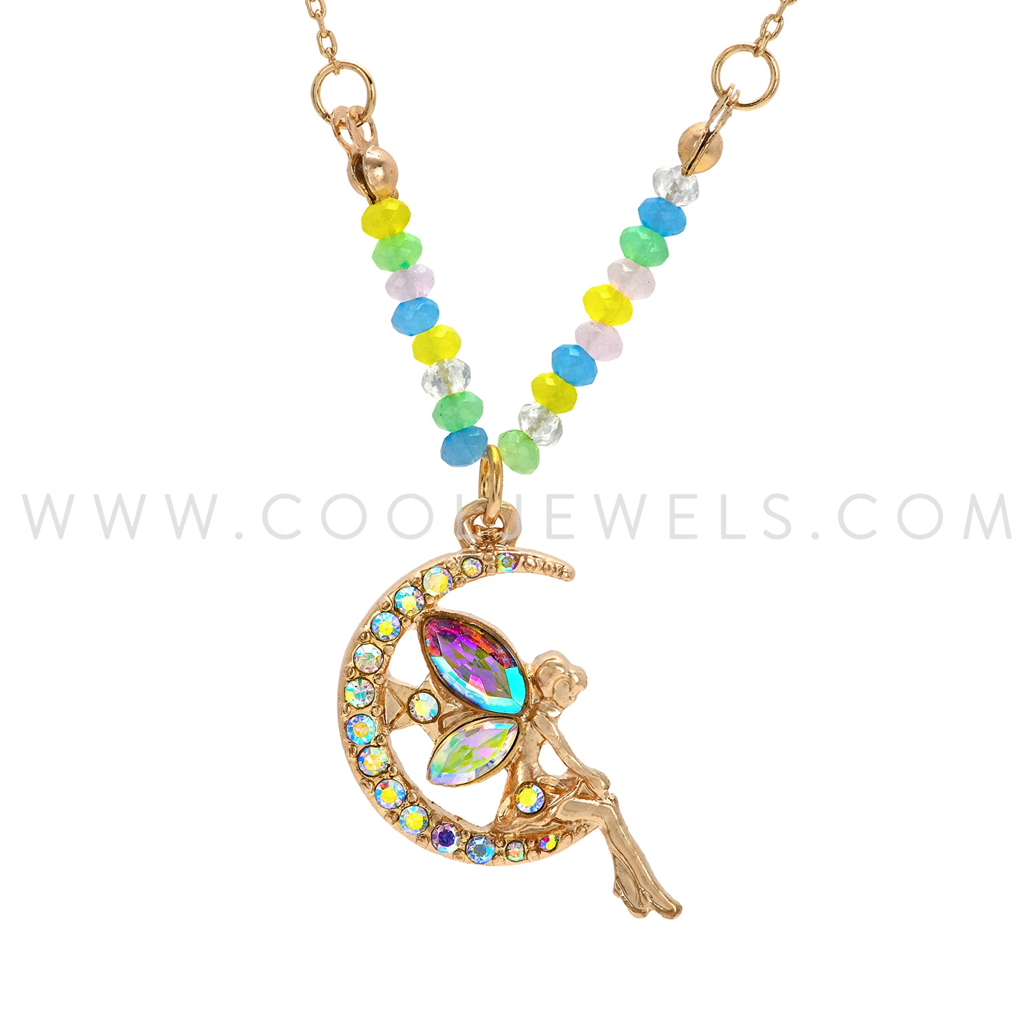LINK CHAIN NECKLACE WITH BEADS AND RHINESTONE MOON & FAIRY PENDANT