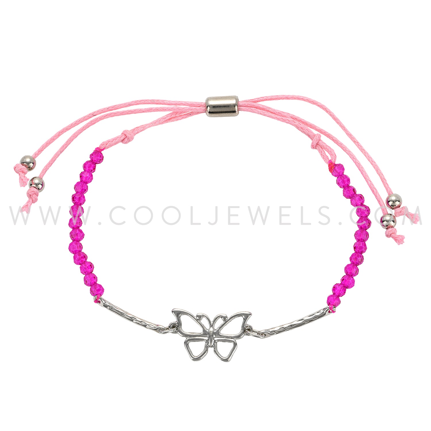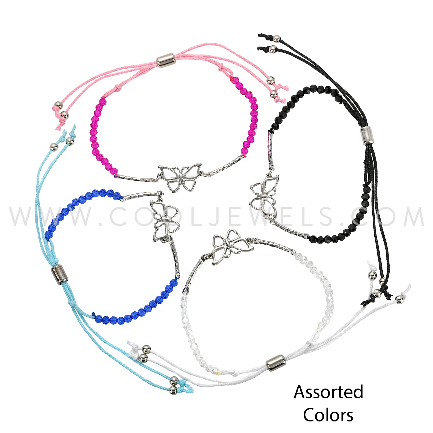 These Assorted Black, Blue & Pink Butterfly Crystal Beaded Bracelet/Anklet features a silver butterfly with two silver accent bars on a crystal beaded slider bracelet/anklet.