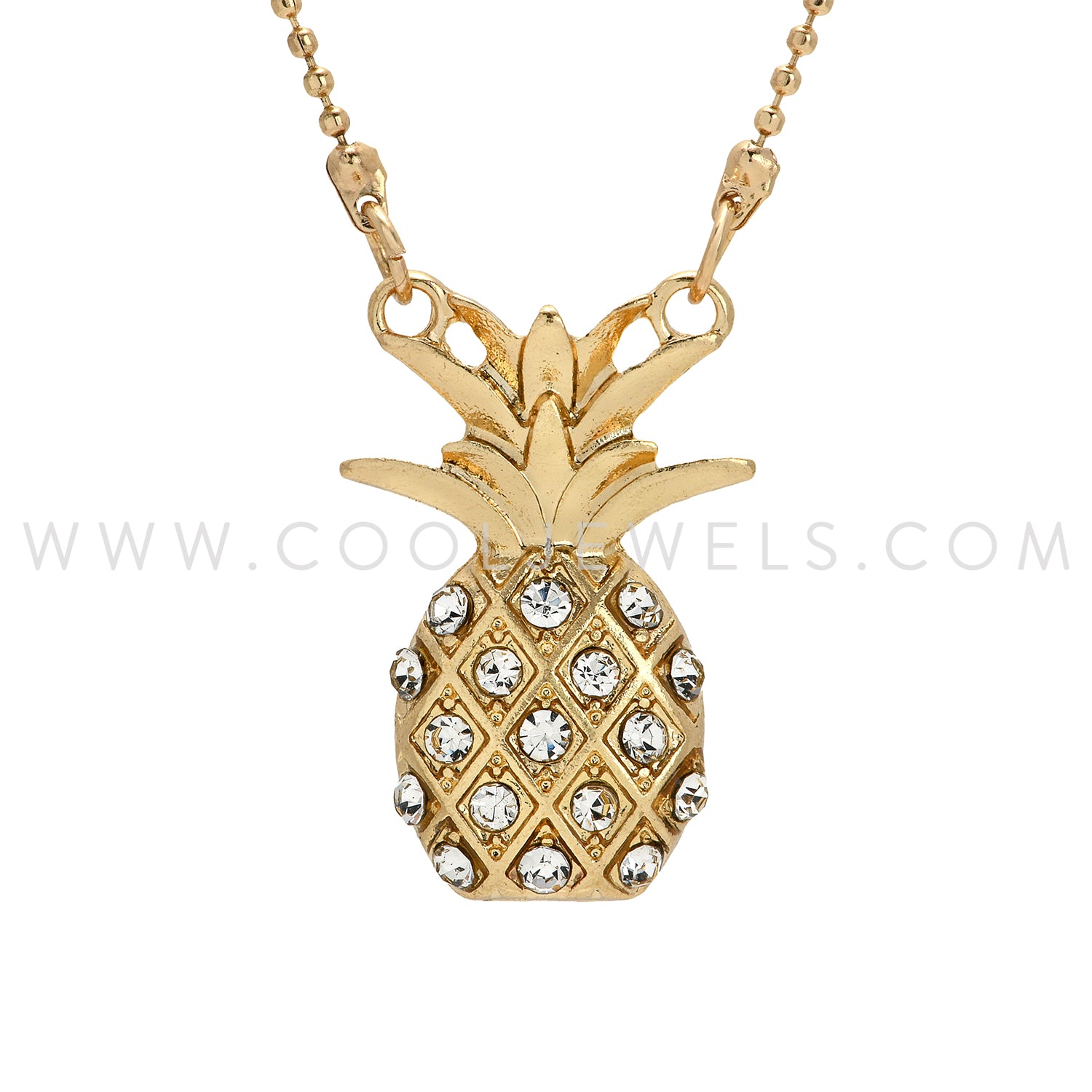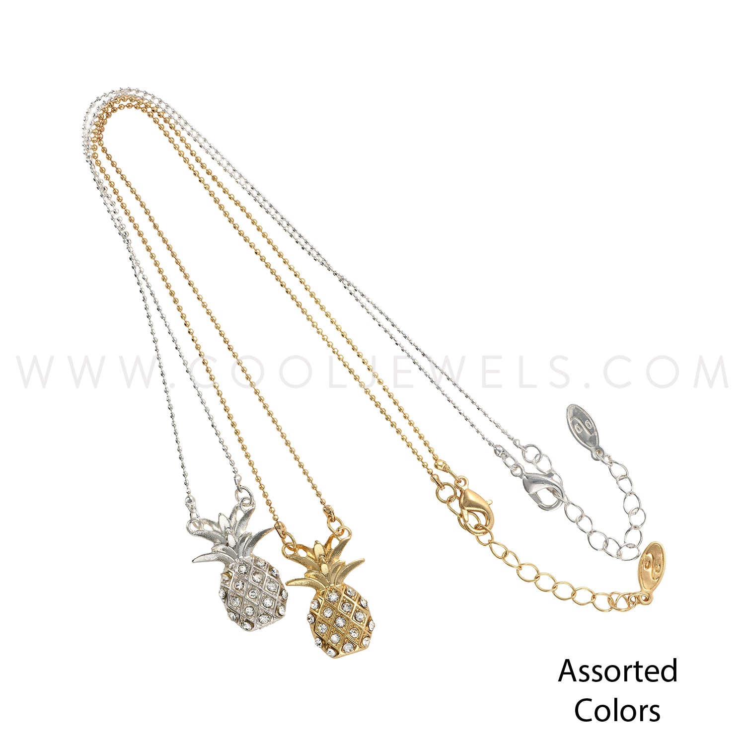 These Assorted Gold & Silver Rhinestone Pineapple Necklace feature a rhinestone and pineapple pendant suspended on a diamond cut ball chain necklace.