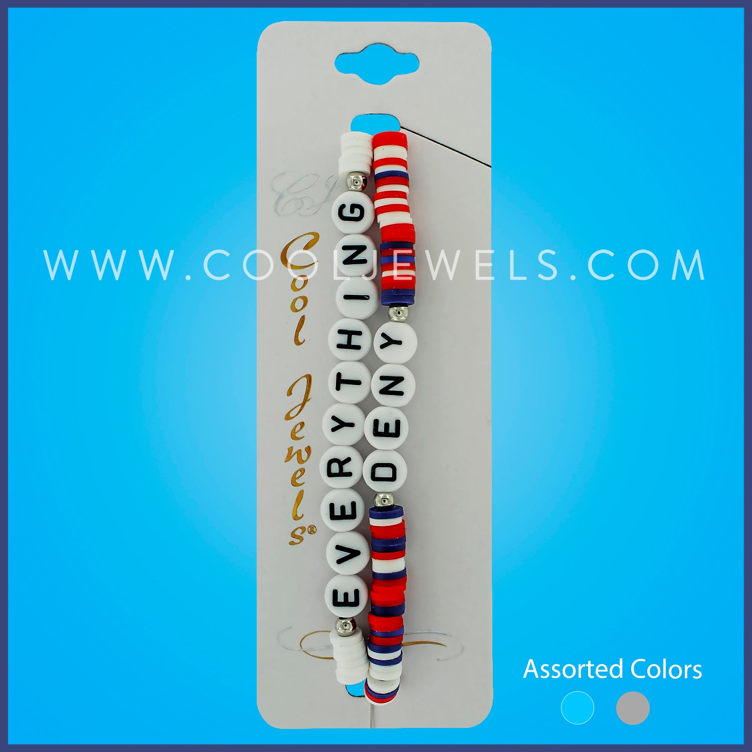 (SET OF 2) STRETCH FIMO BRACELETS WITH "DENY EVERYTHING" LETTER BEADS - CARDED