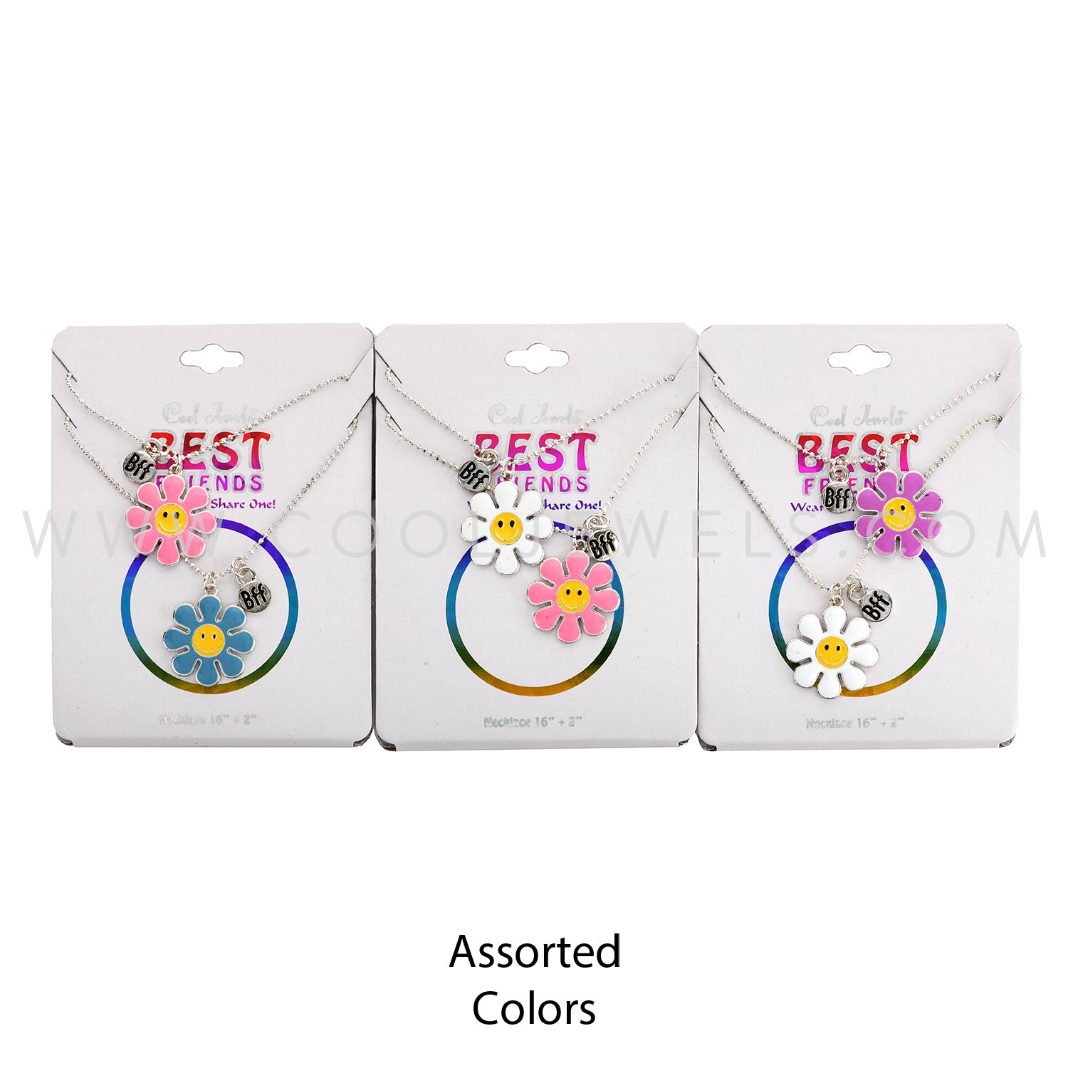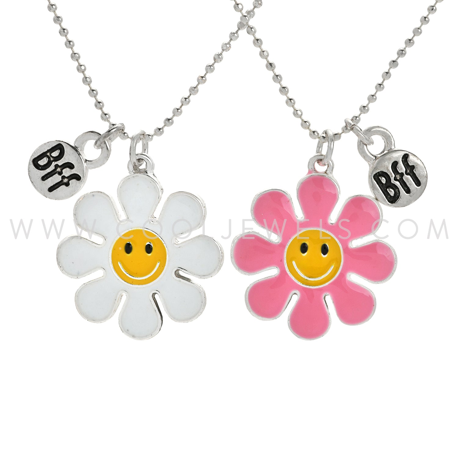 (SET OF 2) SILVER BALL CHAIN NECKLACE WITH HAPPY FACE FLOWER BFF PENDANTS - CARDED