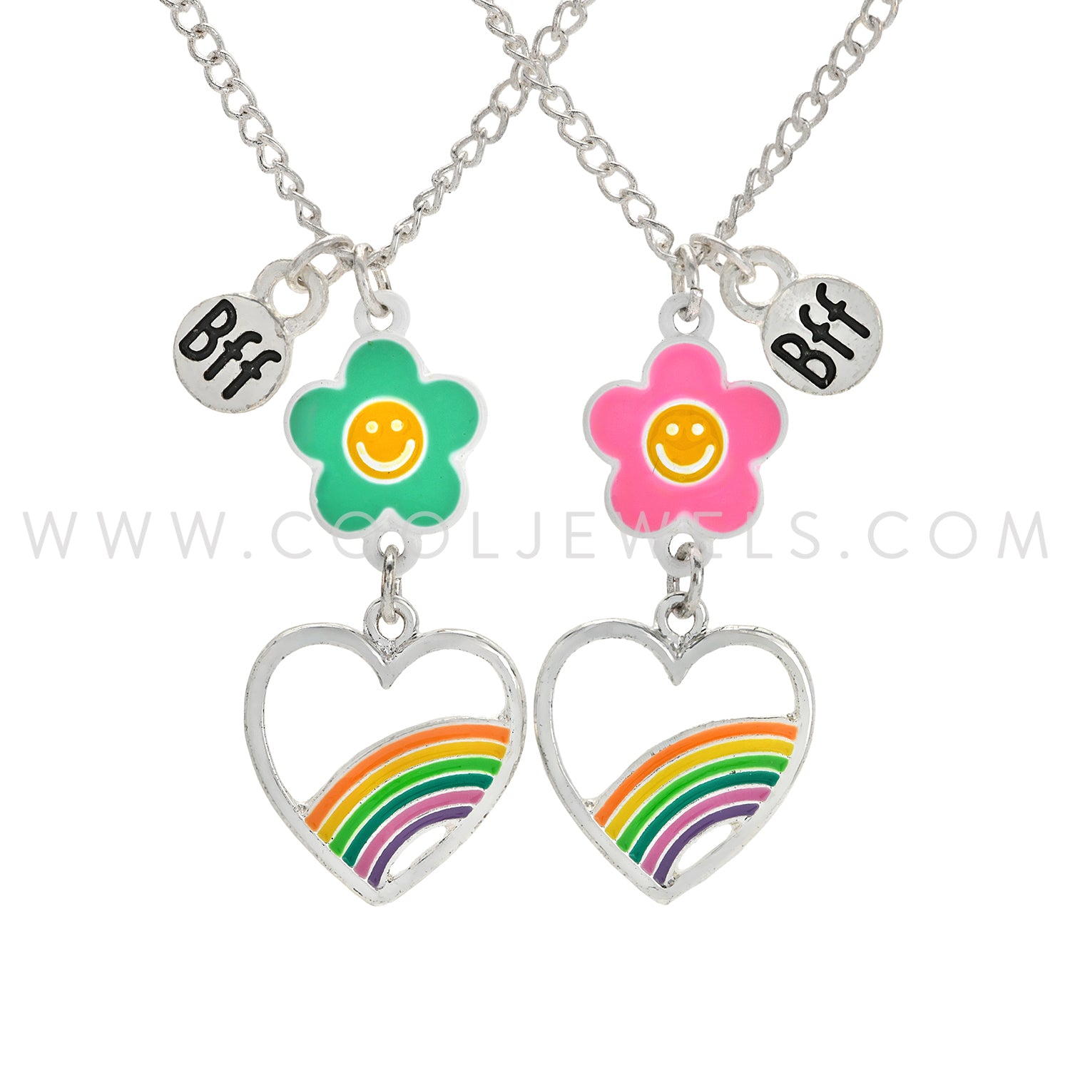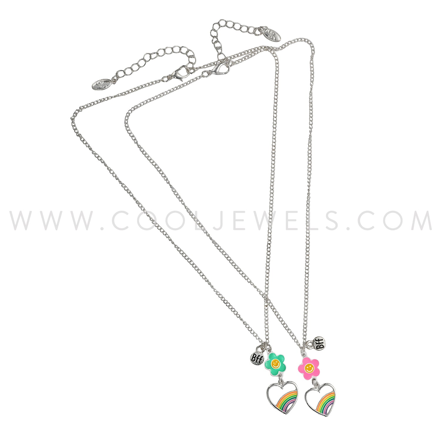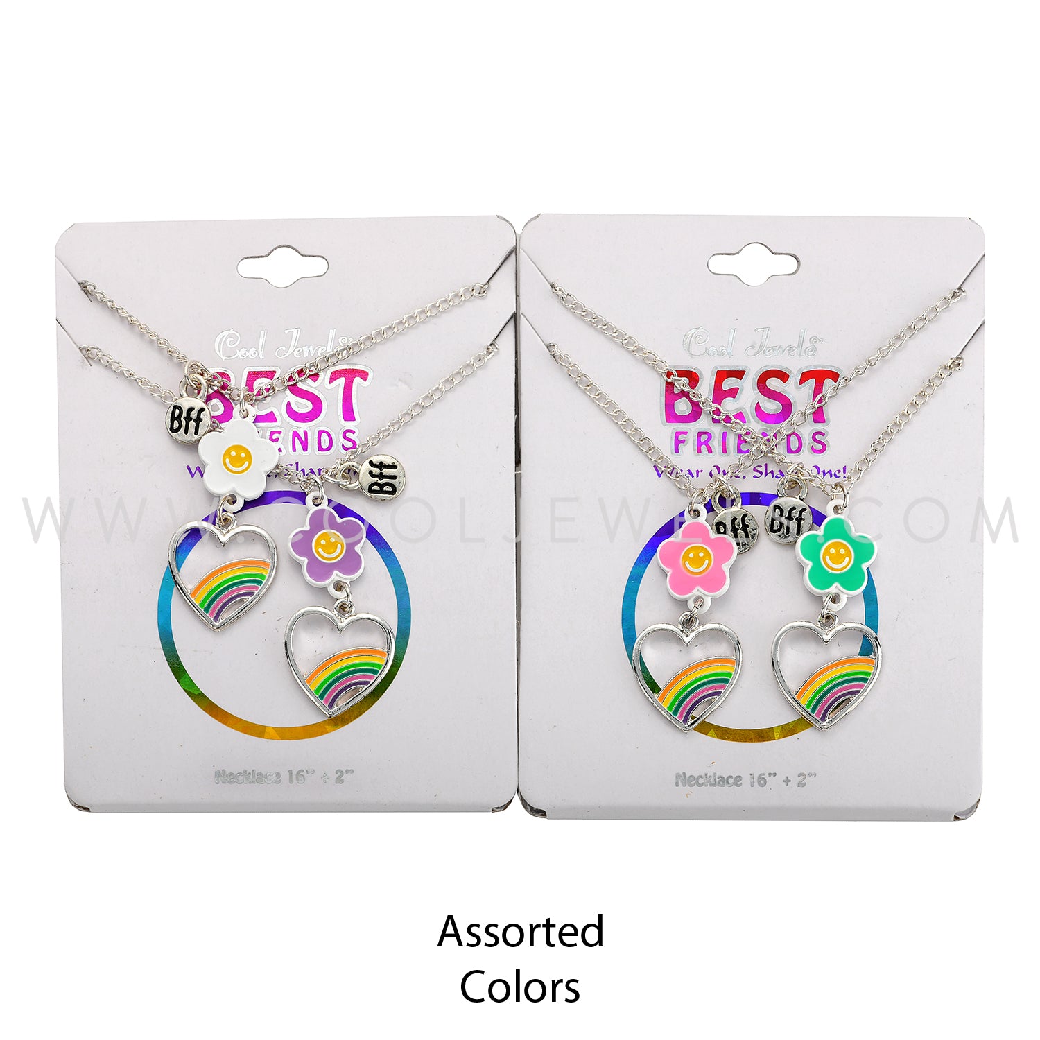 (SET OF 2) LINK CHAIN NECKLACE WITH RAINBOW HEART & FLOWER PENDANTS & BFF CHARMS - CARDED