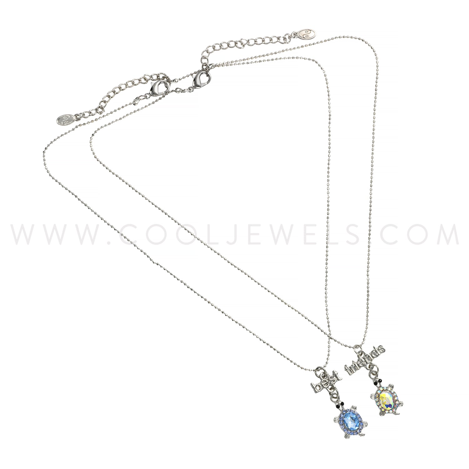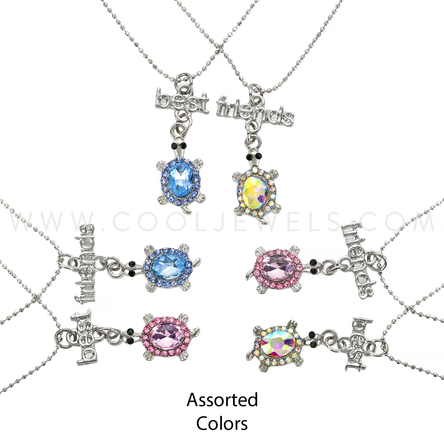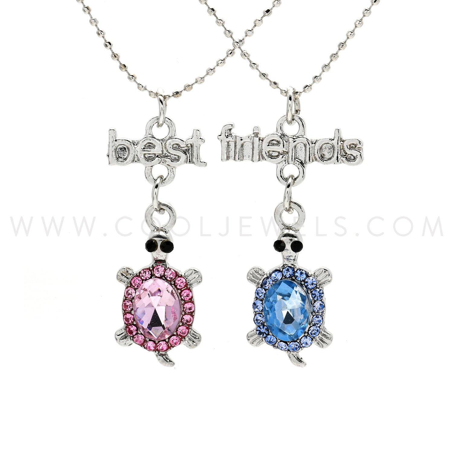 These (Set of 2)Best Friends & Rhinestone Turtle Necklaces feature a set of two (one pink, one blue) best friends and rhinestone turtle pendants suspended on a silver ball chain necklaces