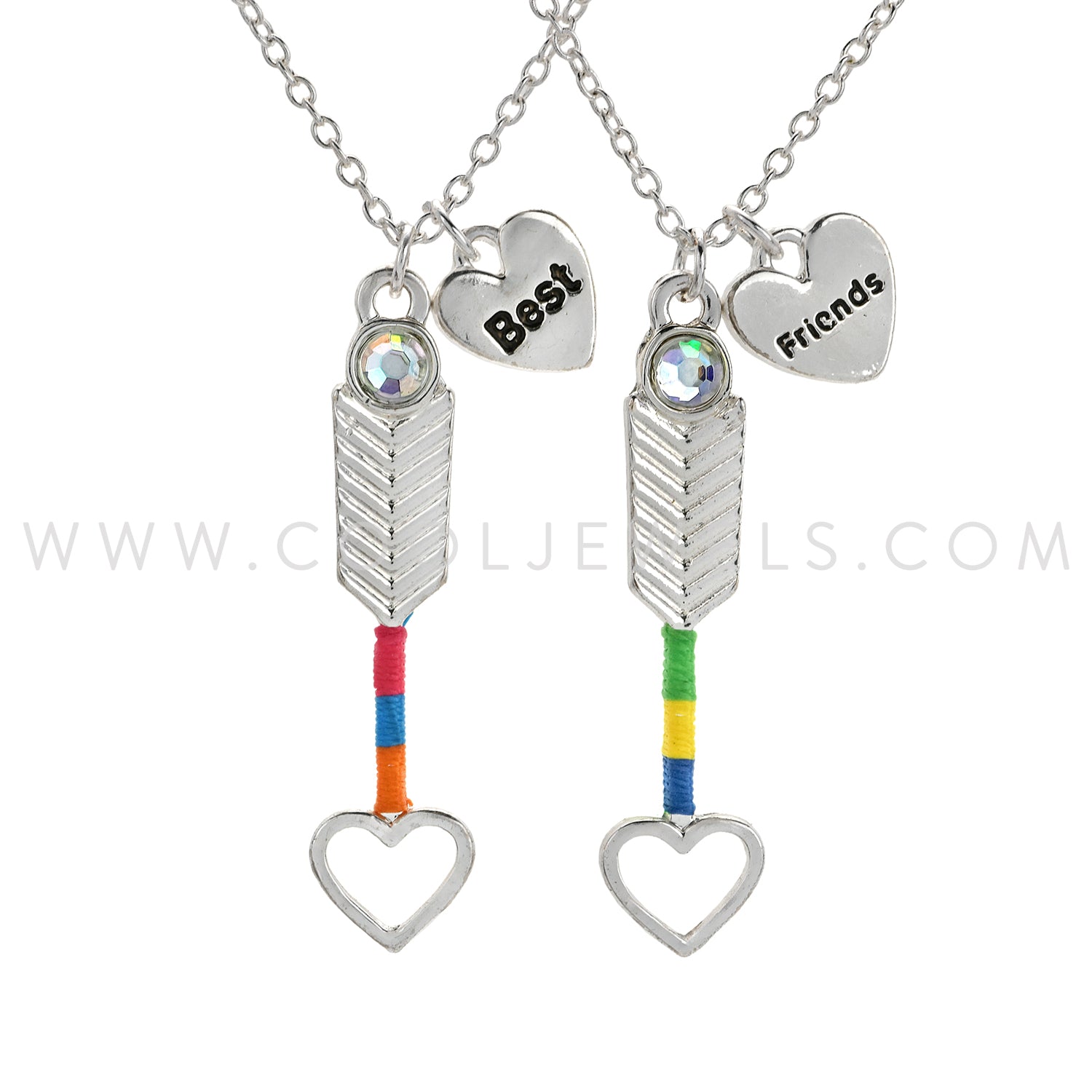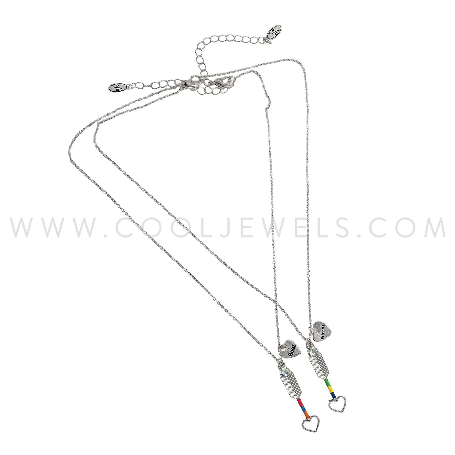 These wonderful (Set of 2) Arrow Best Friends Necklaces feature two colorful arrows with hearts and best friends heart charms suspended on a silver chain link necklace.