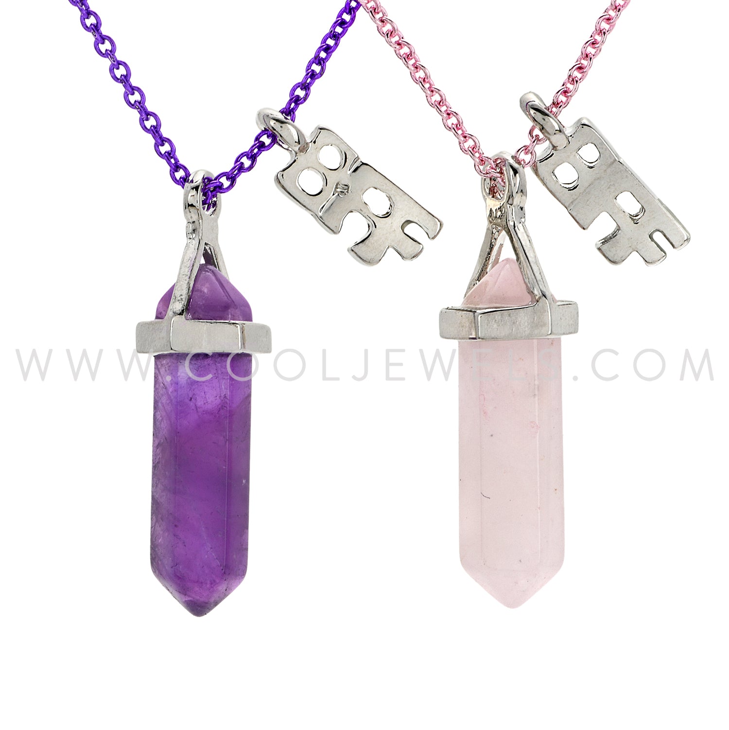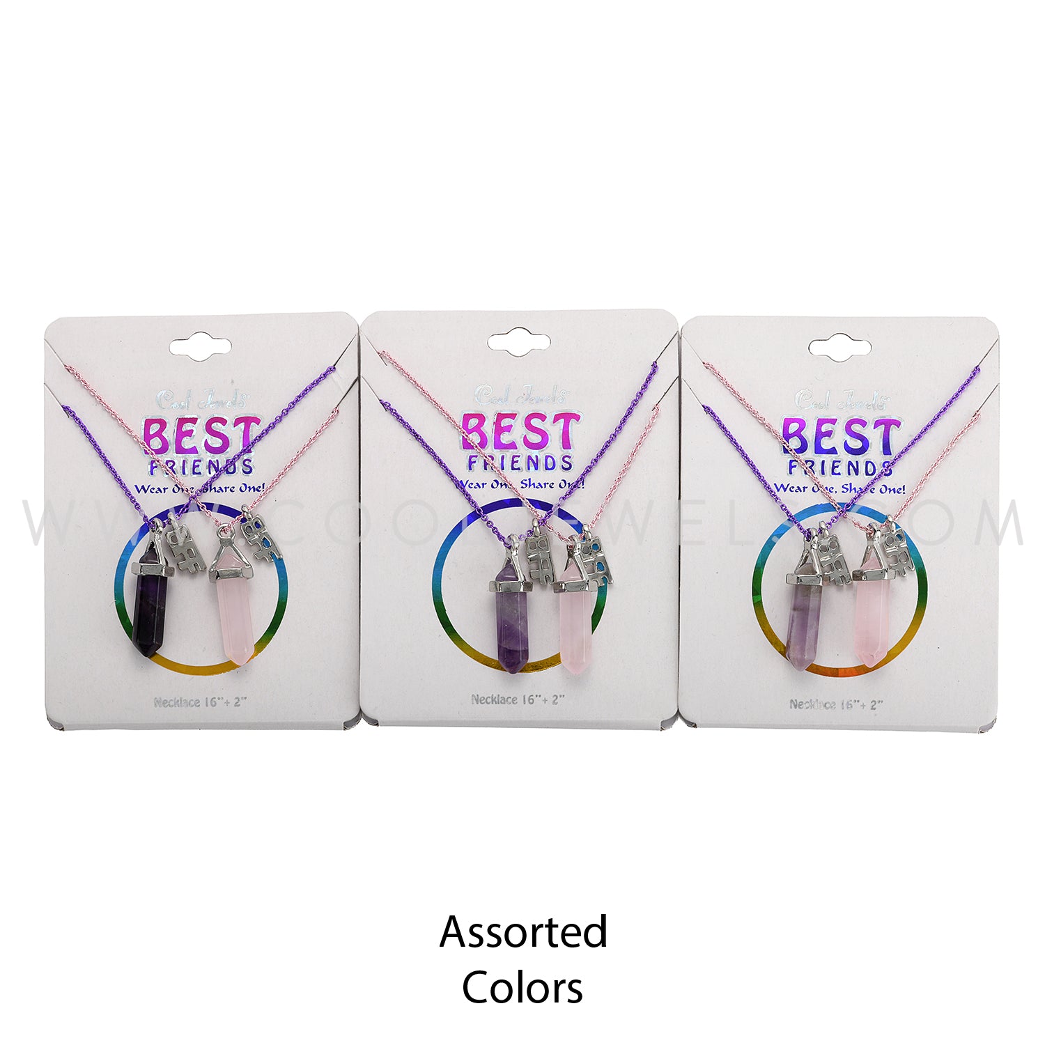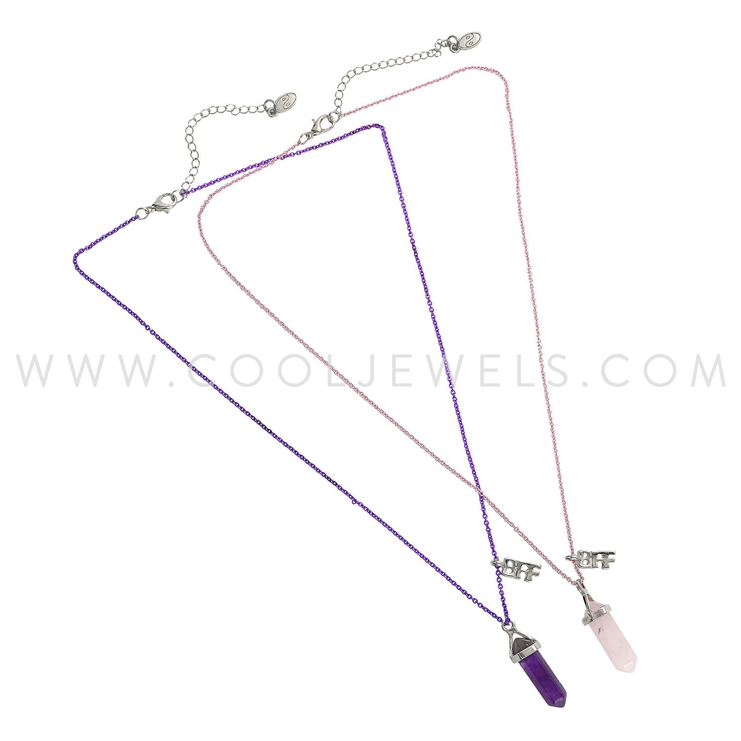 (SET OF 2 ) LINK CHAIN NECKLACE WITH AMETHYST & ROSE QUARTZ STONE "BFF" - CARDED