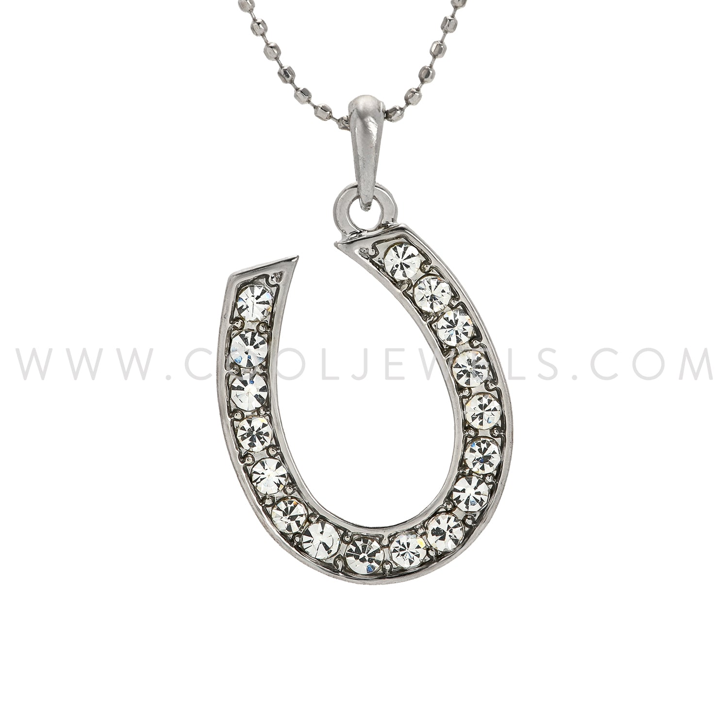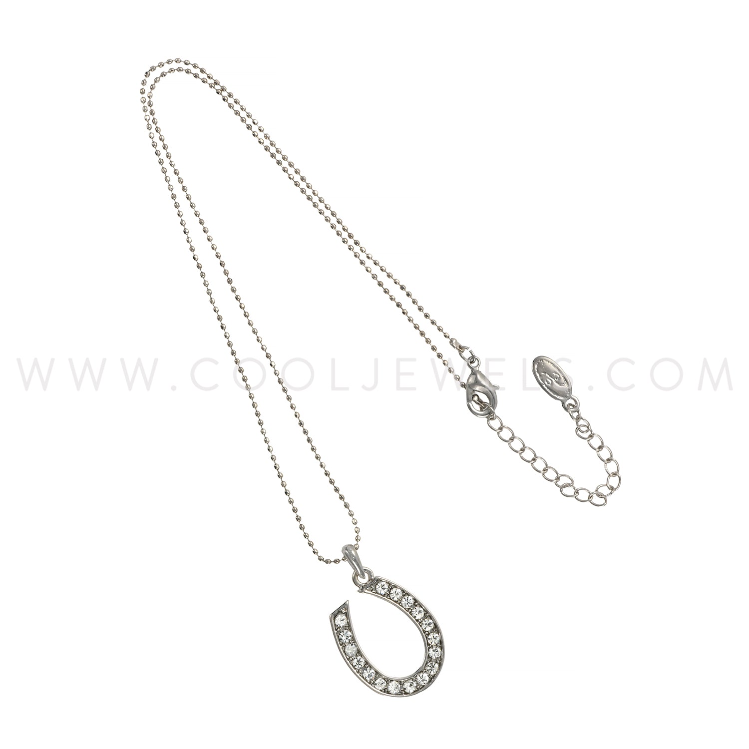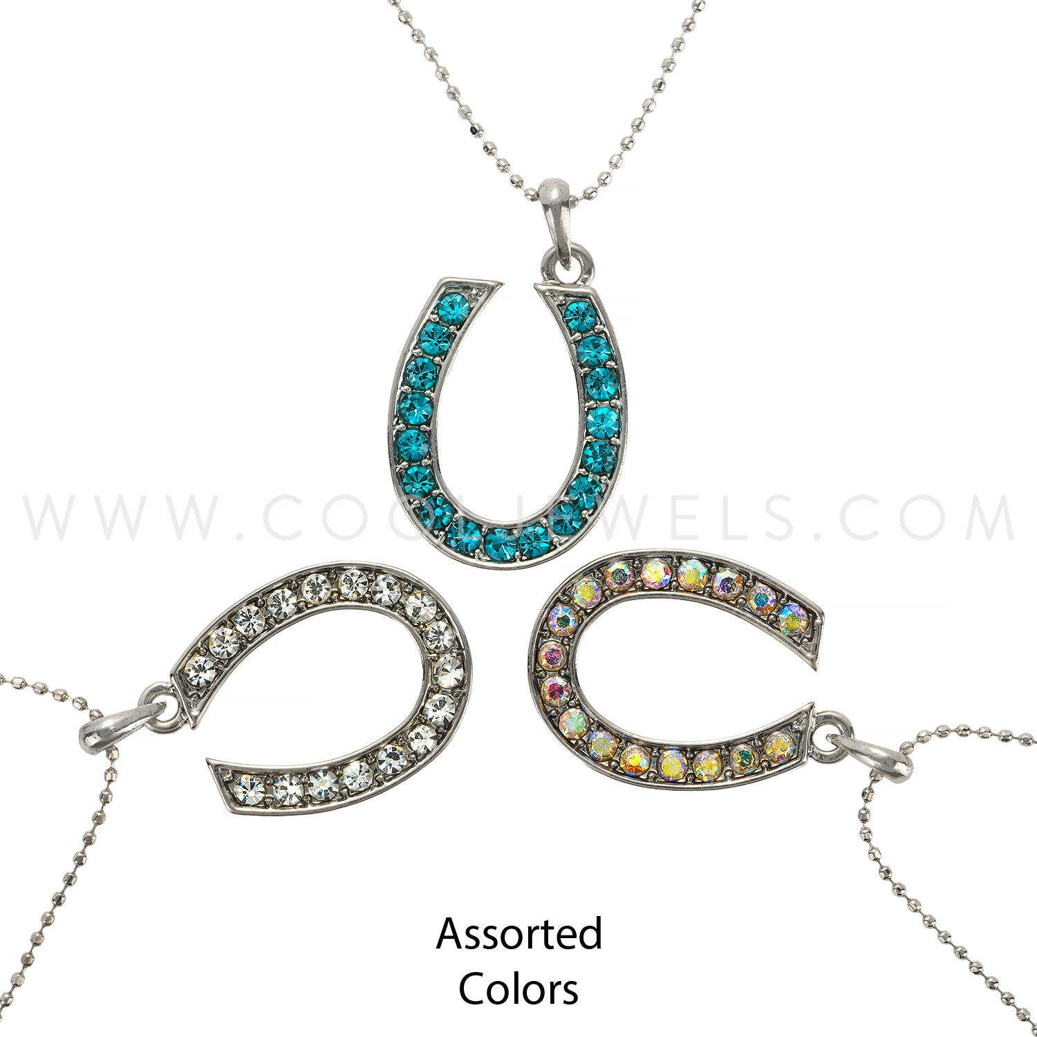 These Assorted Light Blue, Clear, and Multi-colored Rhinestone Horseshoe Necklaces feature a rhinestone horseshoe pendant suspended on a silver diamond cut ball chain necklace.