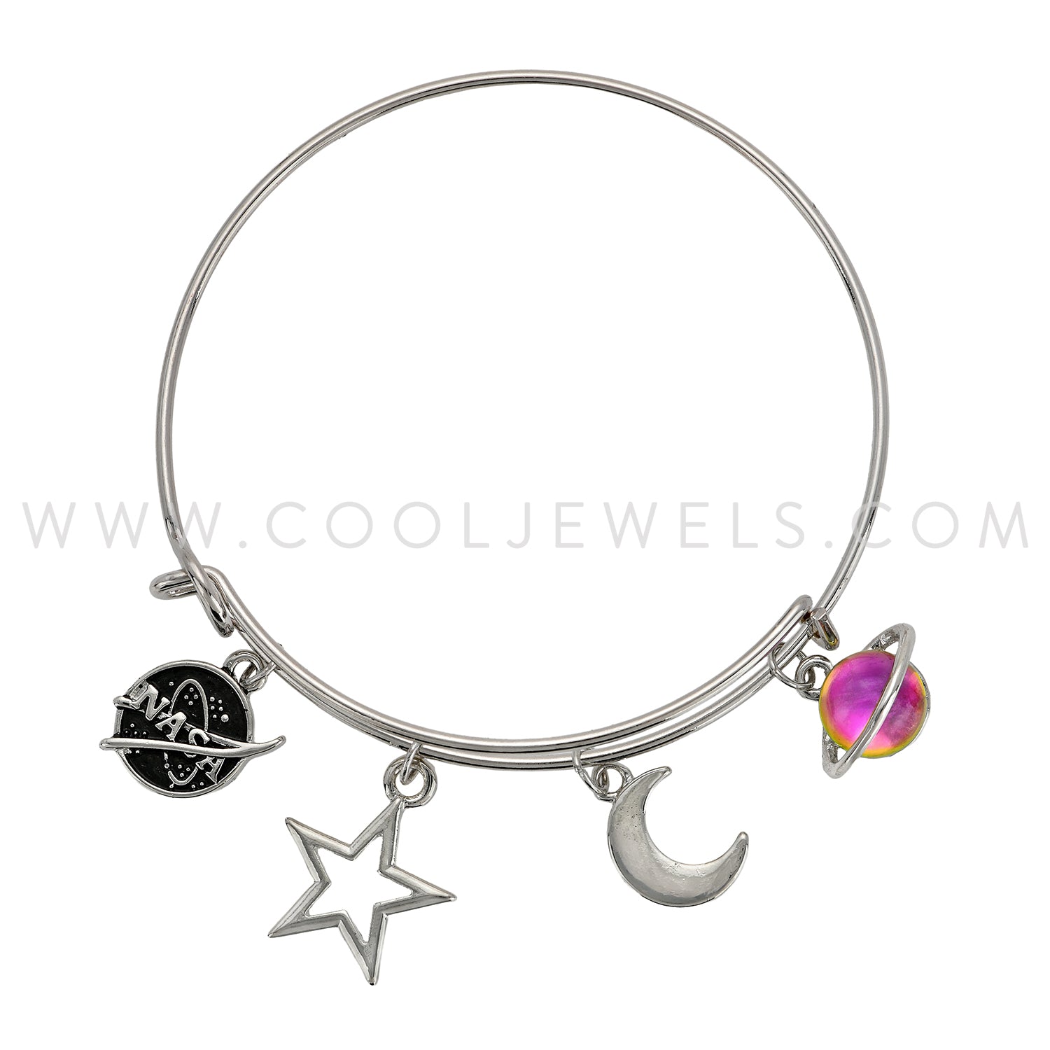 These Nasa Saturn Silver Bangle Bracelets feature a variety of charms accented with a NASA logo, moon, Saturn and star pendant.