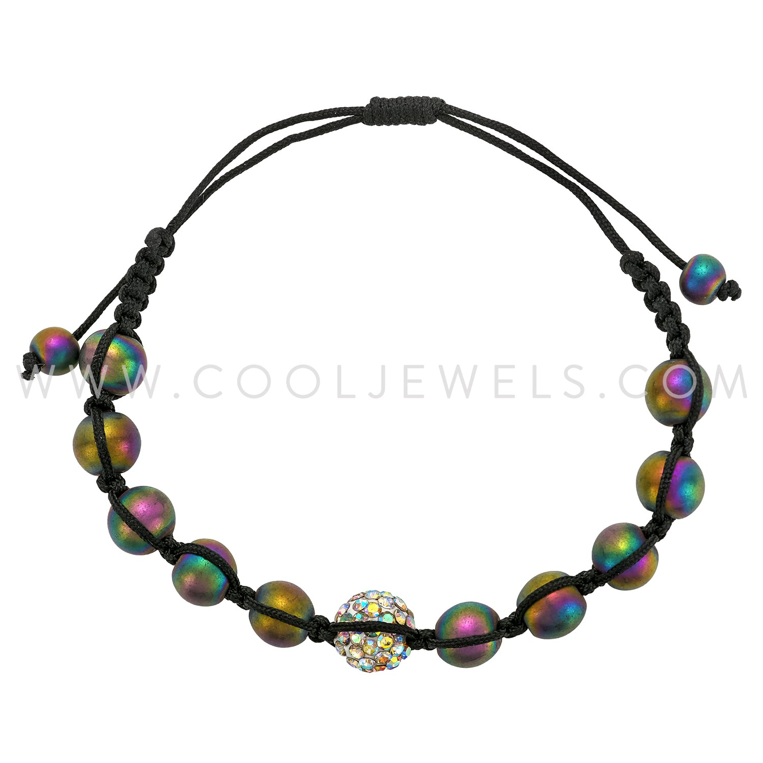 These AB Hematite Beads Bracelet feature a black slider bracelet with ab hematite beaded band.