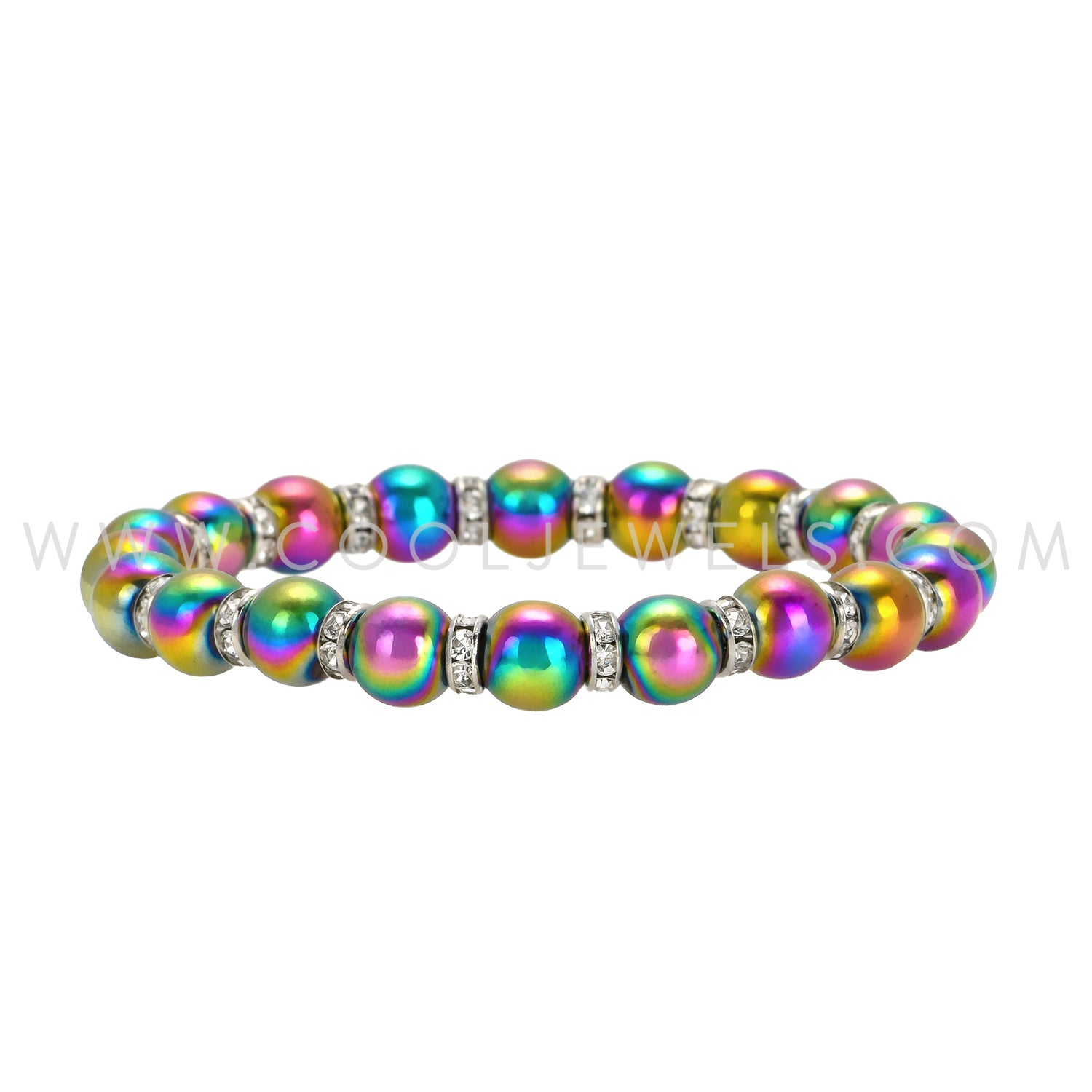 These cool Rainbow Hematite & Rhinestone Bracelet features a rainbow hematite bead and rhinestone stretch bracelet.