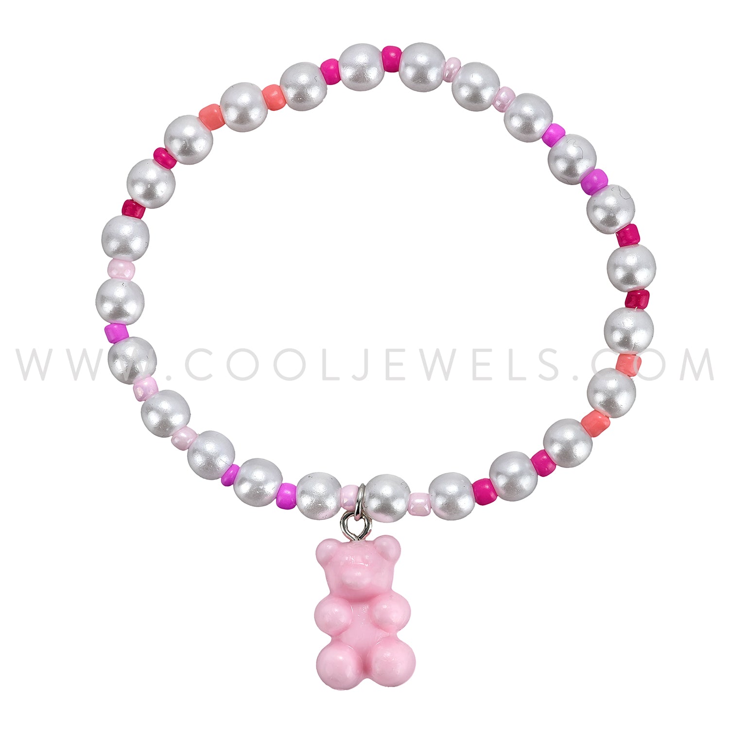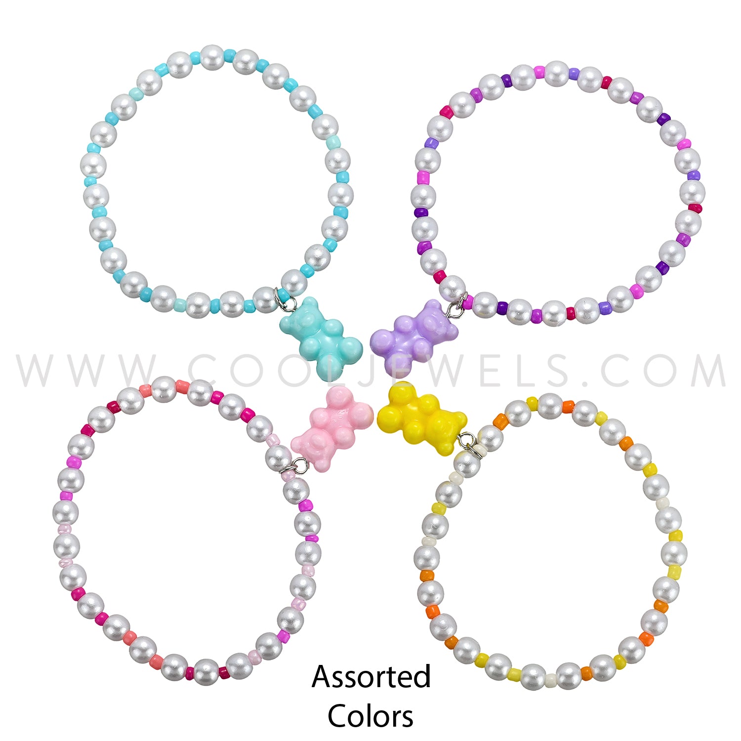 STRETCH BEADED BRACELET WITH WHITE & COLOR BEADS & TEDDY BEAR PENDANT - ASSORTED