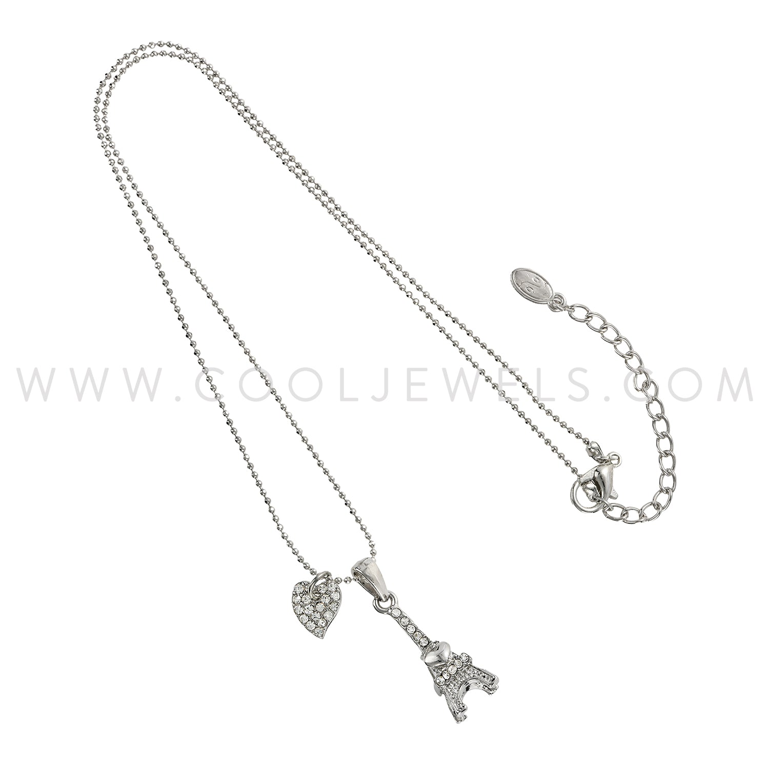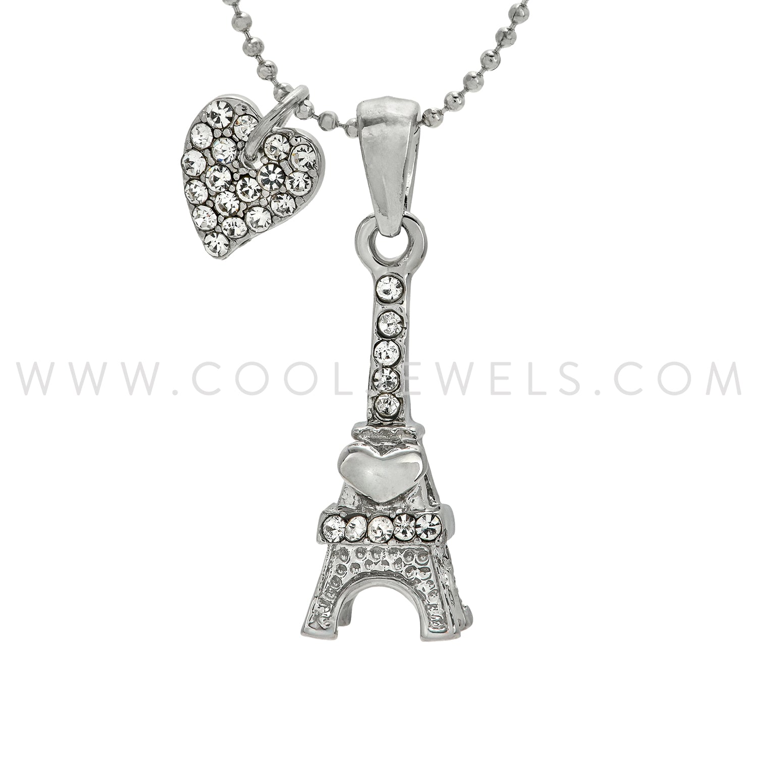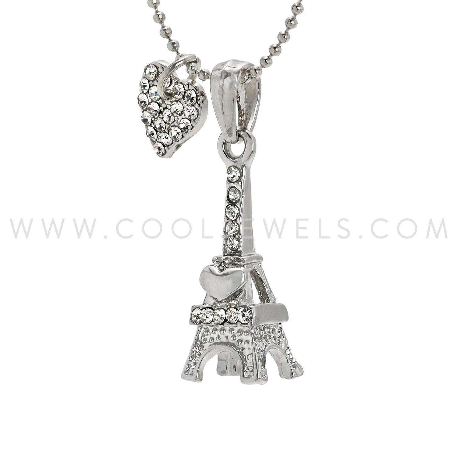 SILVER BALL CHAIN NECKLACE WITH EIFFEL TOWER & RHINESTONE HEART