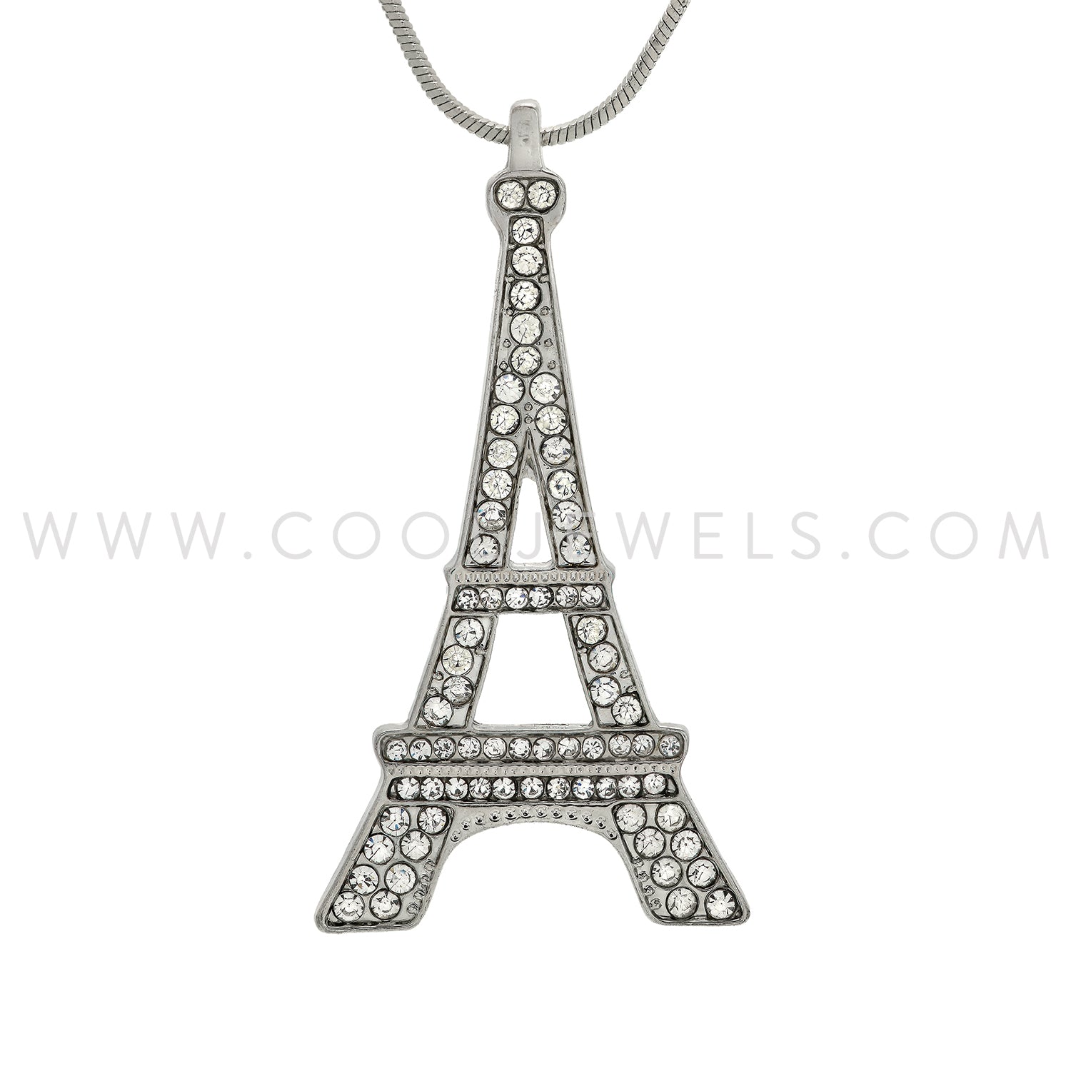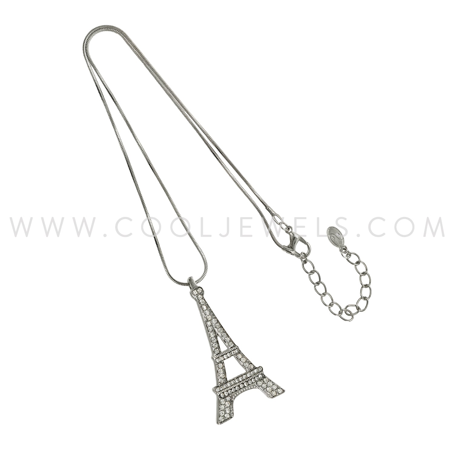 This Rhinestone Eiffel Tower Necklace comes on a silver snake chain with a rhinestone Eiffel Tower pendant.