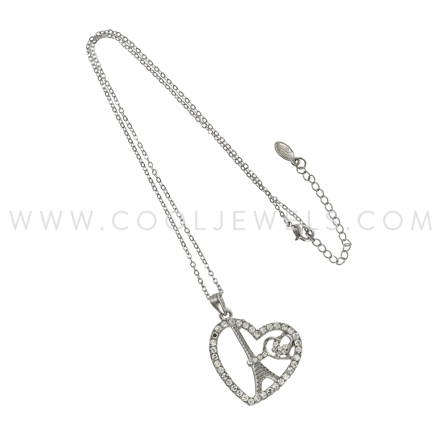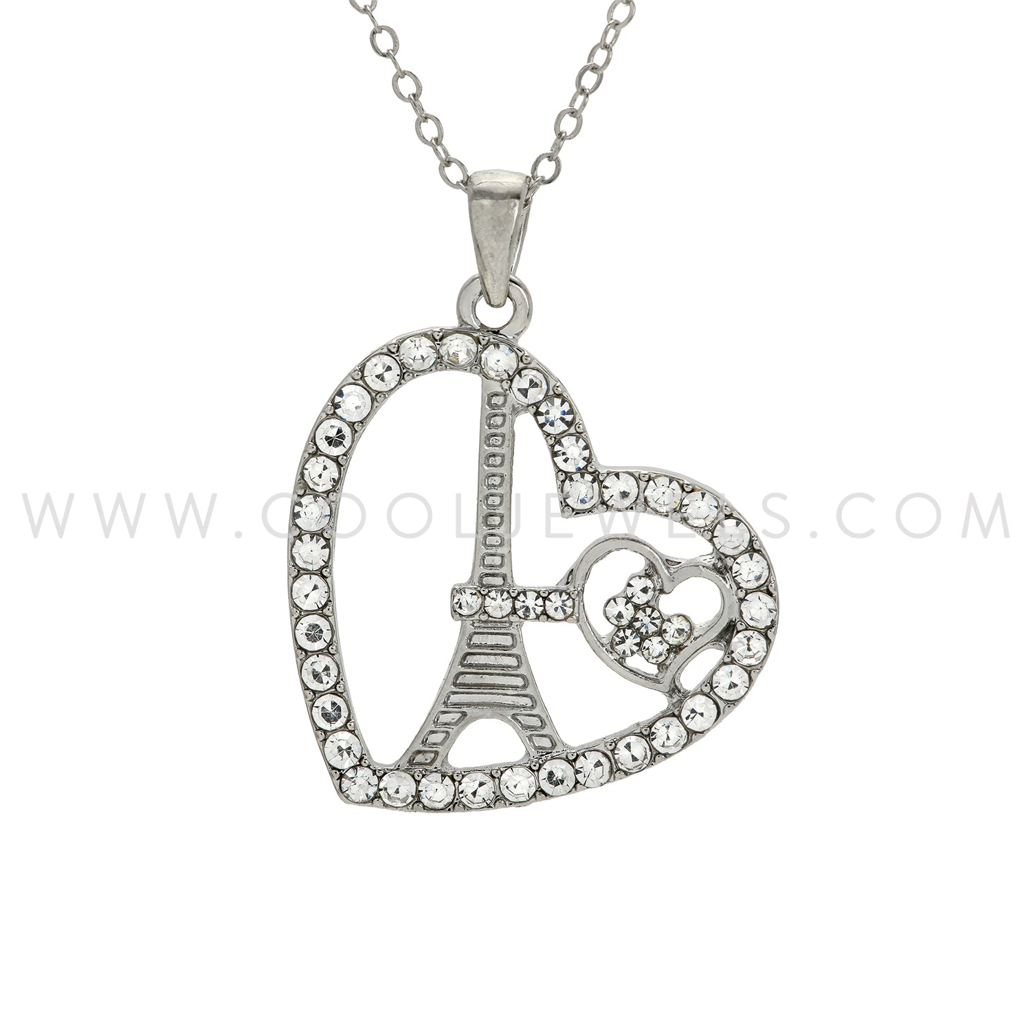 These Eiffel Tower Rhinestone Necklaces each feature a rhinestone Eiffel Tower within a rhinestone heart pendant on a silver chain.
