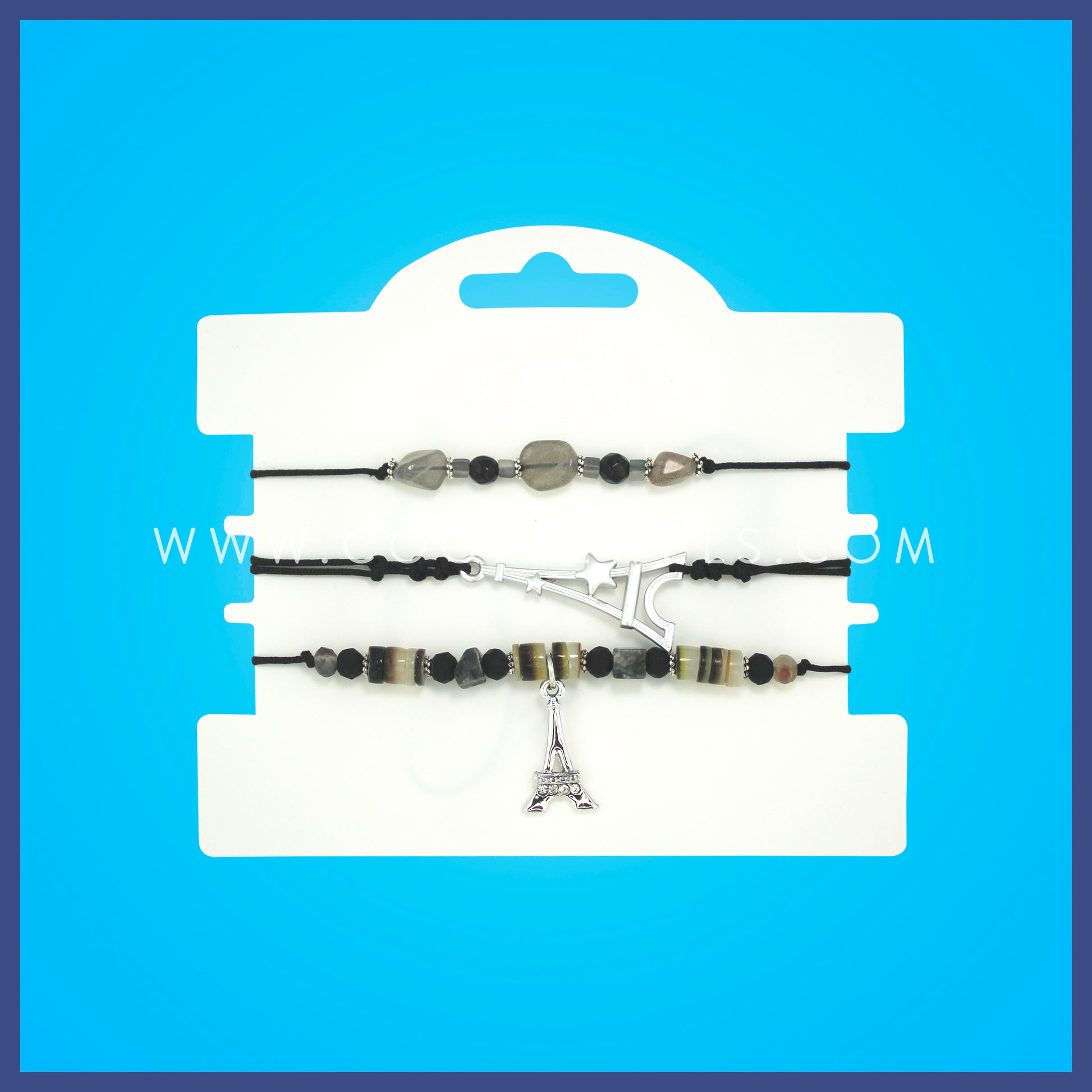 Set of 3 Slider Cord Bracelets with Eiffel Tower and Color Beads.