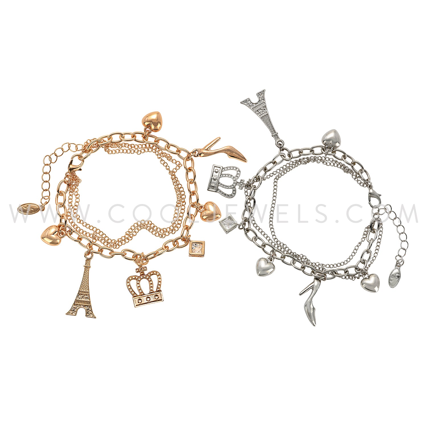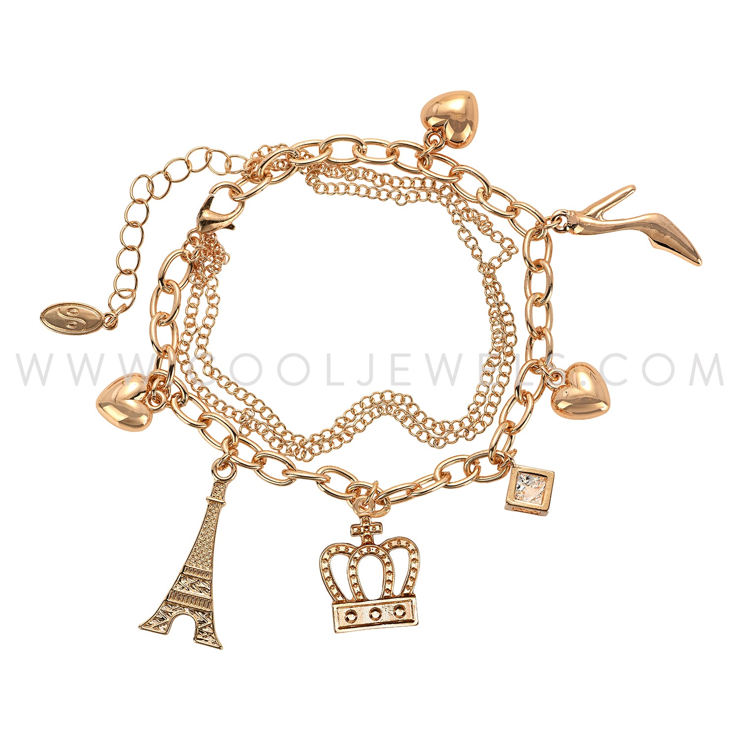 TRIPLE LINK CHAIN BRACELET WITH EIFFEL TOWER, CROWN, HEEL, AND HEART CHARMS - ASSORTED