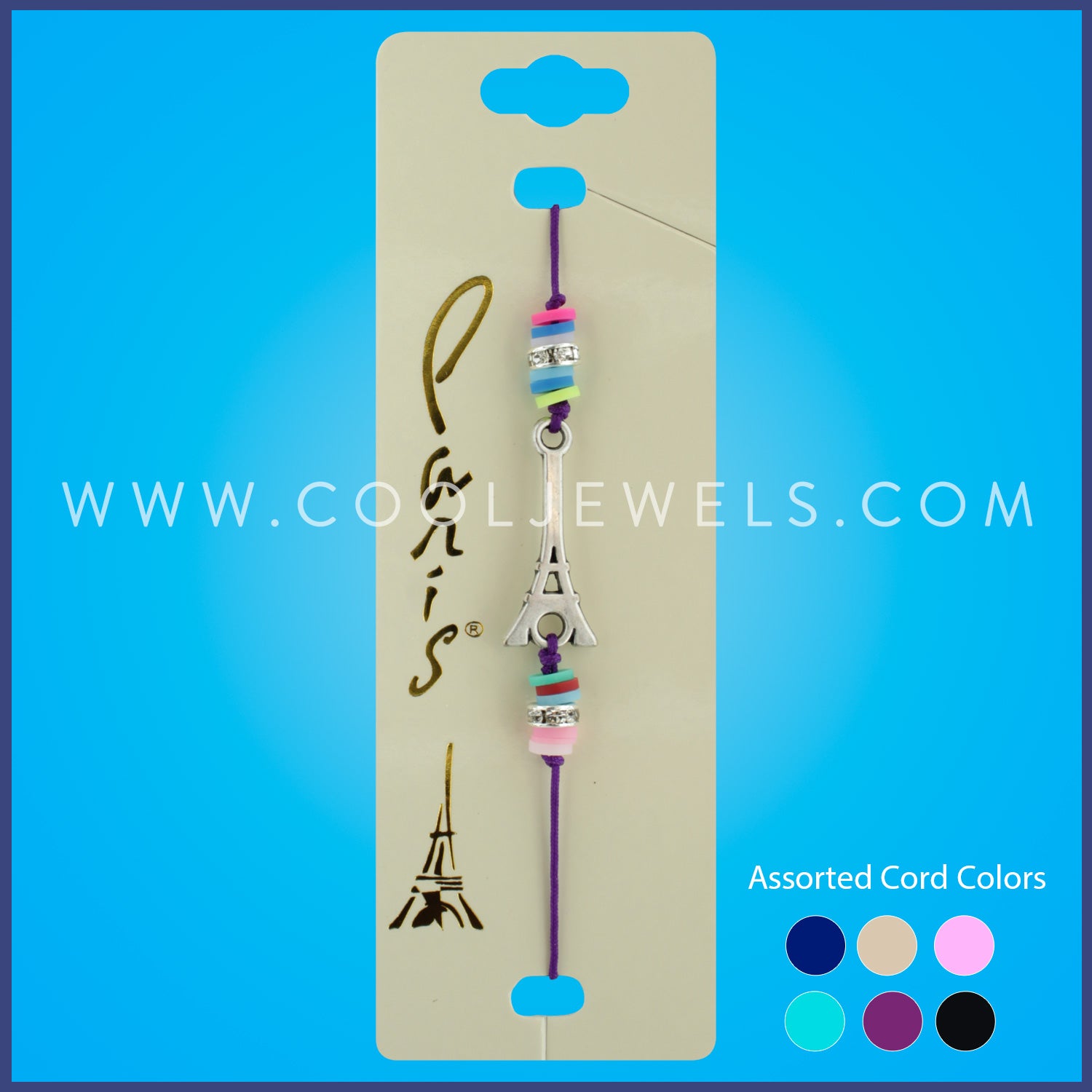 STRING SLIDER BRACELET WITH EIFFEL TOWER & MULTI-COLORED FIMO DISCS - ASSORTED COLORS