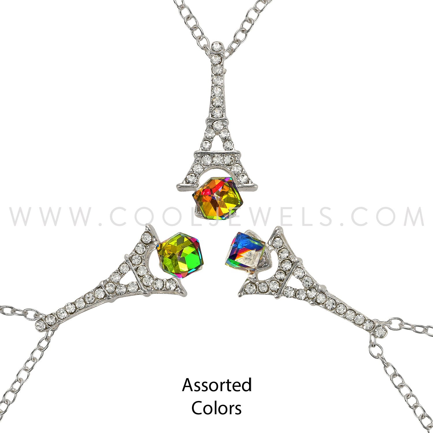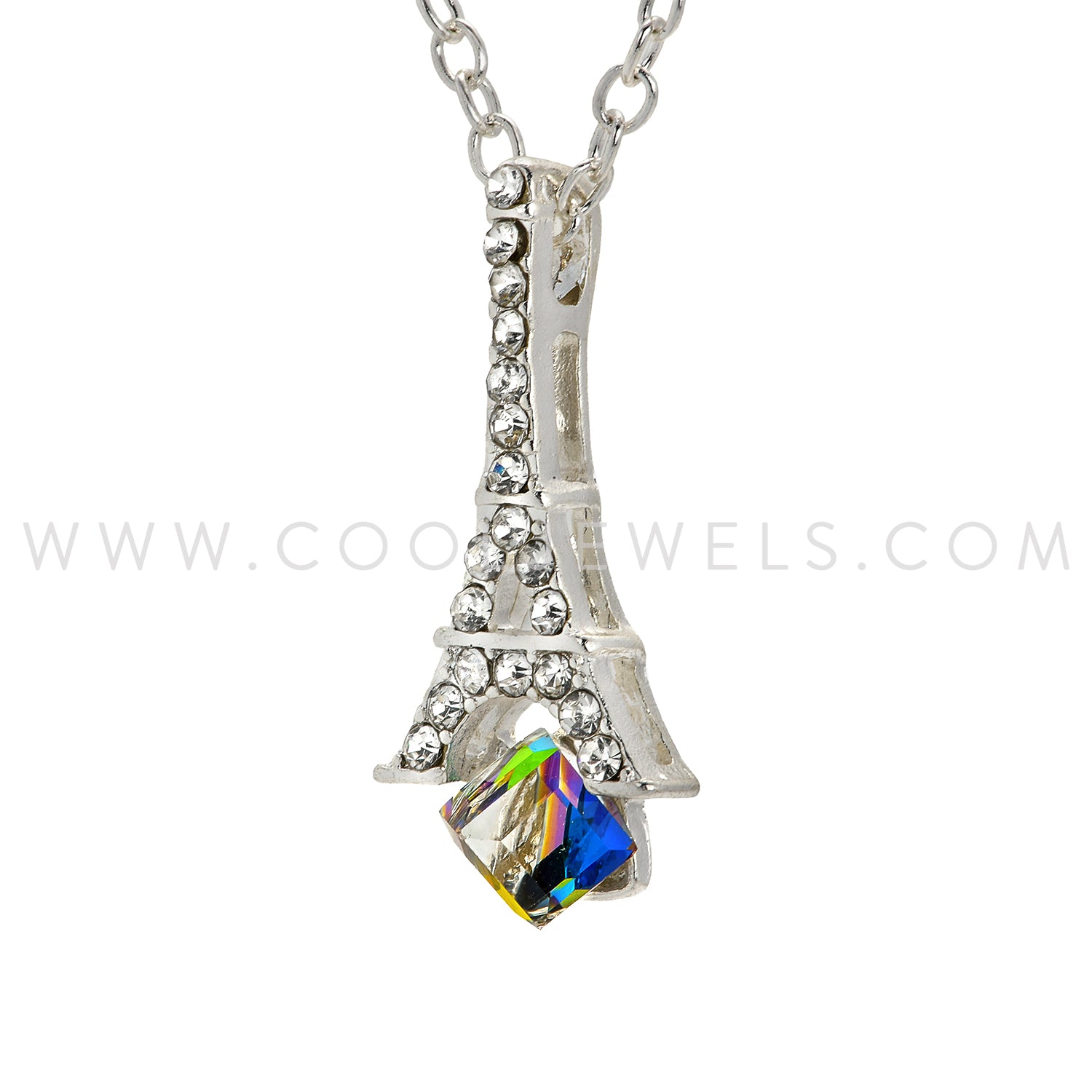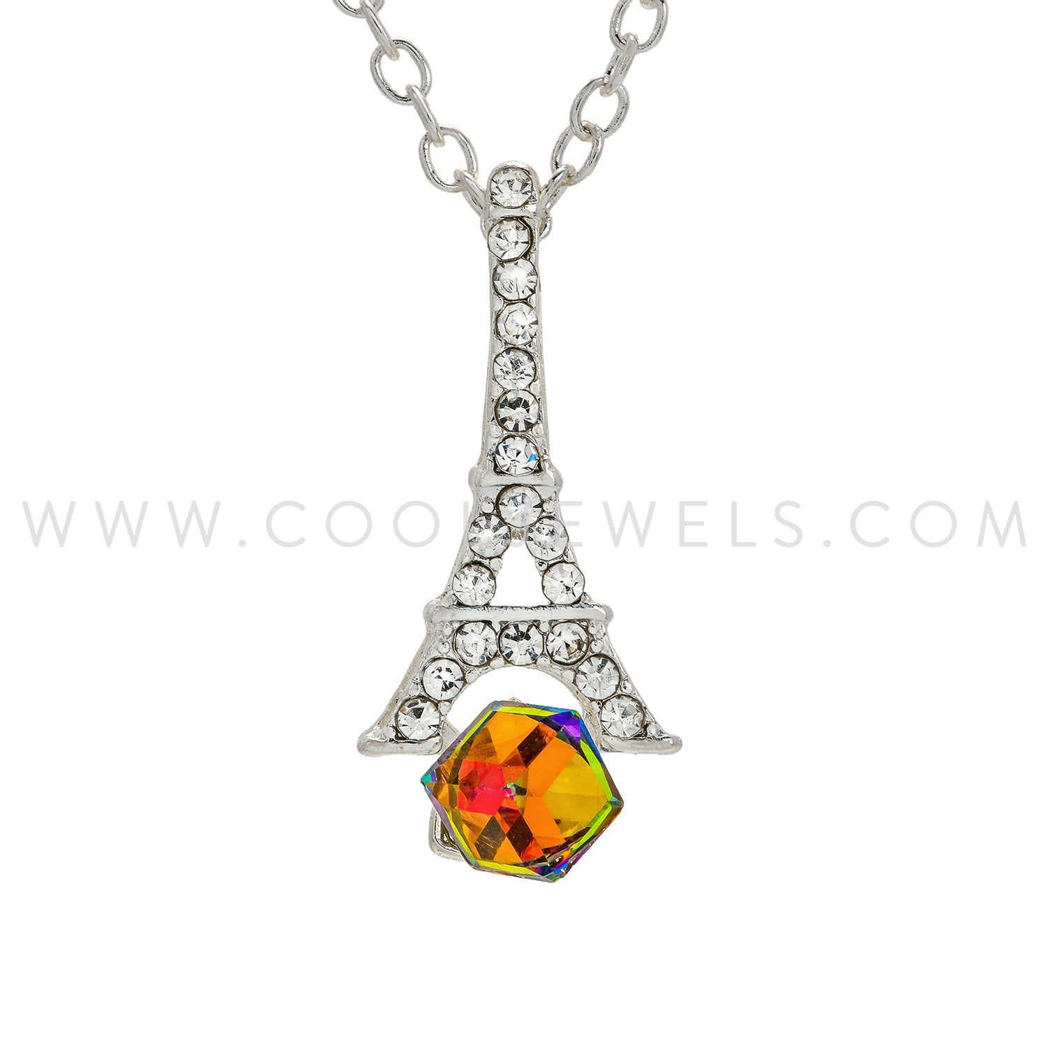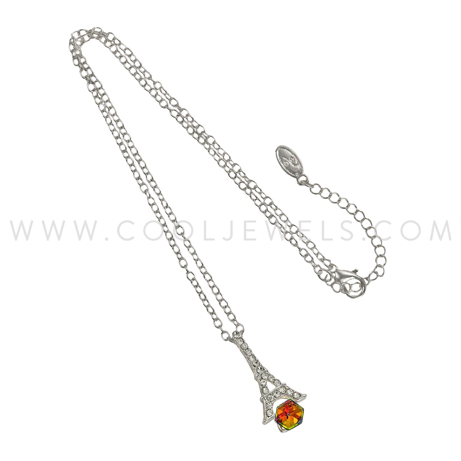 This Stone Eiffel Tower Necklace comes on a silver chain with a rhinestone Eiffel Tower pendant accented with a colored stone.