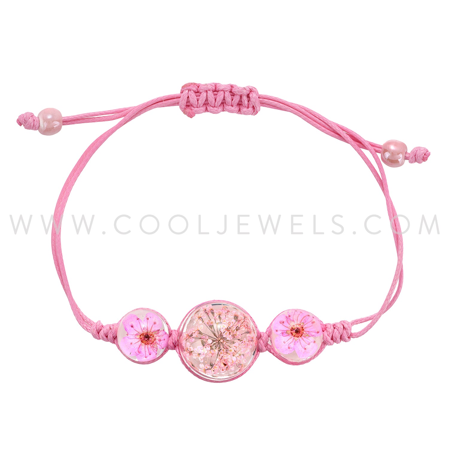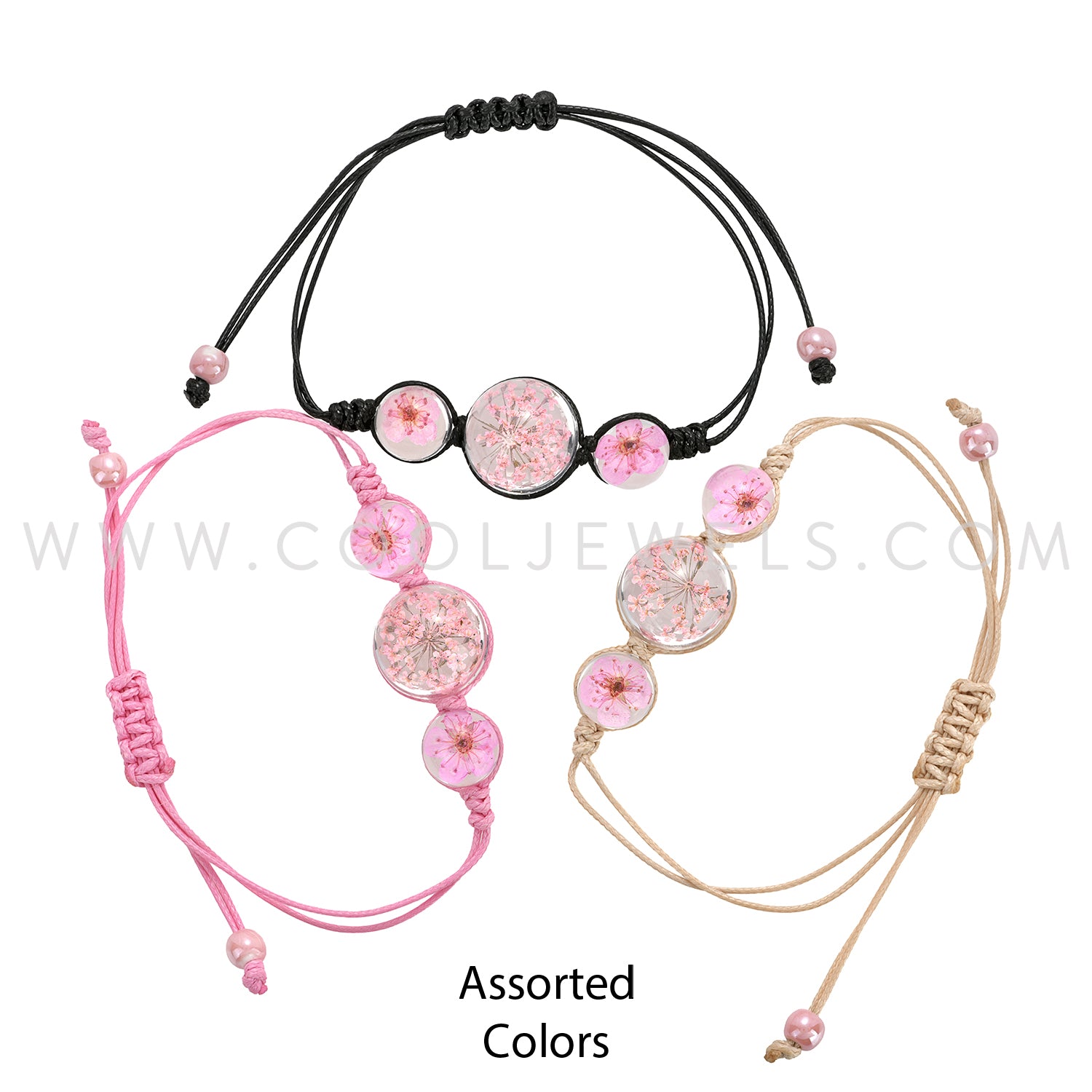SLIDER CORD BRACELET WITH DRIED CHERRY BLOSSOM FLOWER GLOBES - ASSORTED