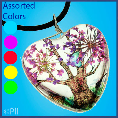 These beautiful Assorted Red, Blue, Purple, Yellow, & Green Dried Flower & Tree Heart Pendant Necklace features a heart shaped resin pendant with small dried flowers, a tree & butterflies.