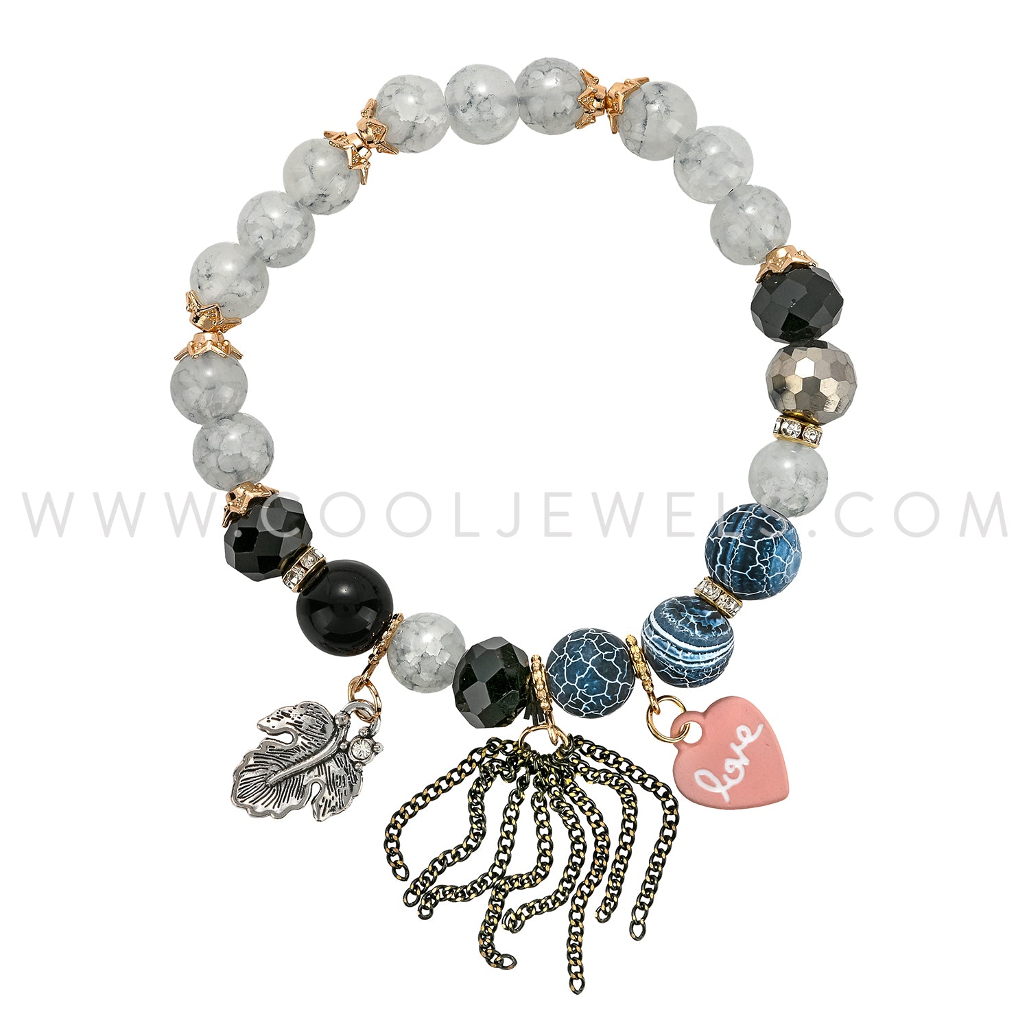 These Assorted Crystal & Frosted Beads Bracelet features an assortment of colored crystal and frosted beads with a rhinestone leaf, "love" heart pendant, & drop chains with gold accents.