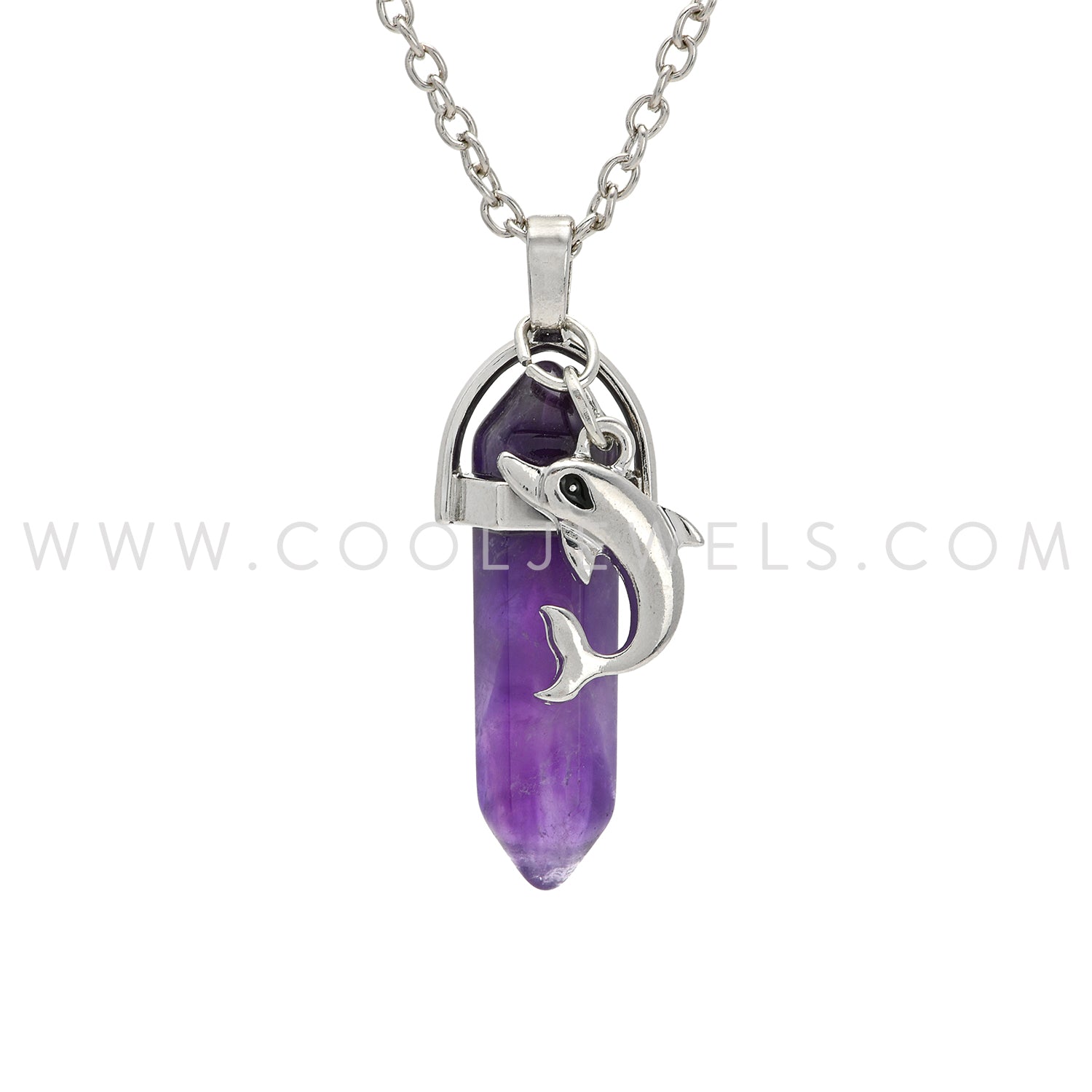 These beautiful Assorted Blue, Pink, Purple, Orange, & Green Dolphin & Crystal Pendant Necklaces feature a dolphin and crystal pendants suspended from a silver chain link necklace.