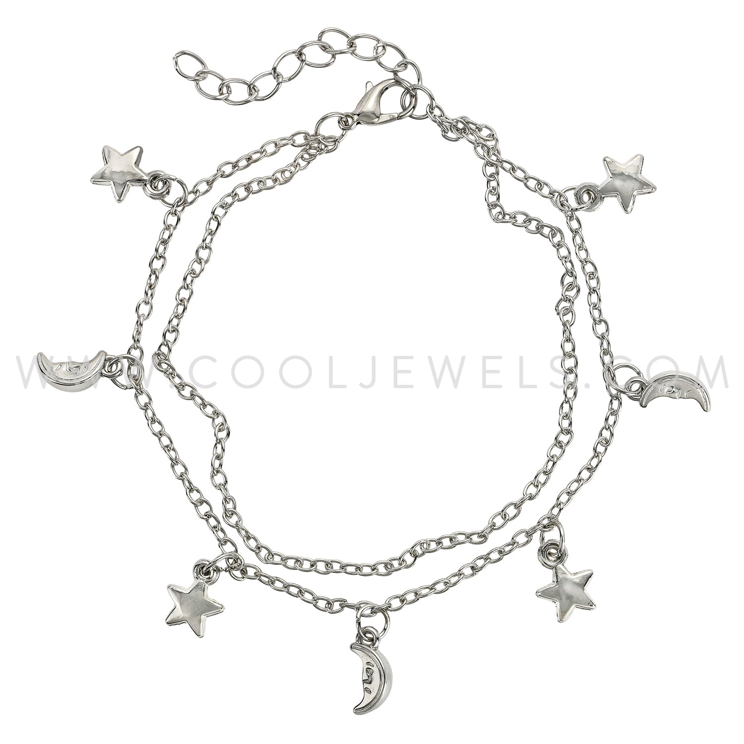 These Silver Moon and Stars Anklets feature a silver chain accented with silver moons and stars.