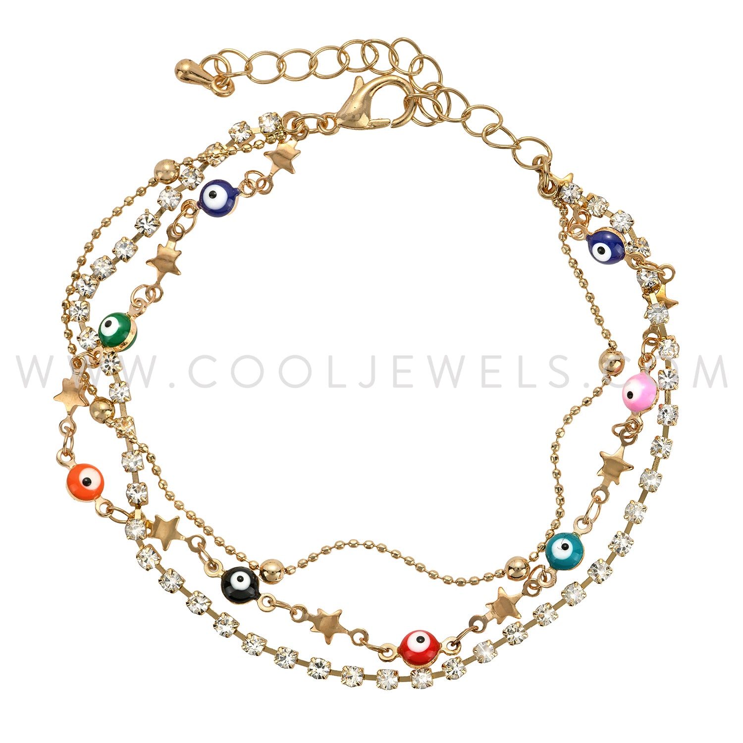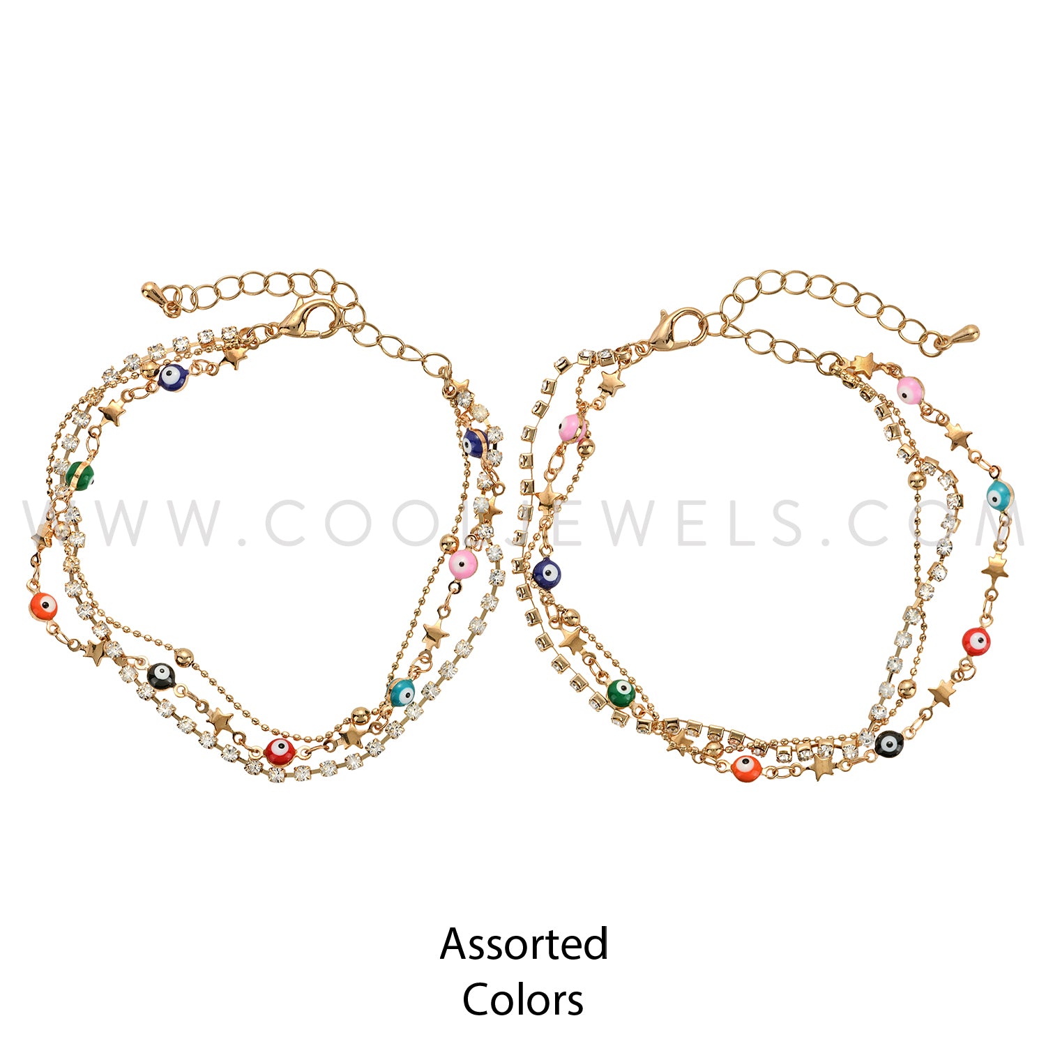 These Rhinestone Evil Eye Beaded Anklets feature a gold ball chain anklet band and an evil eye pendant with rhinestones.