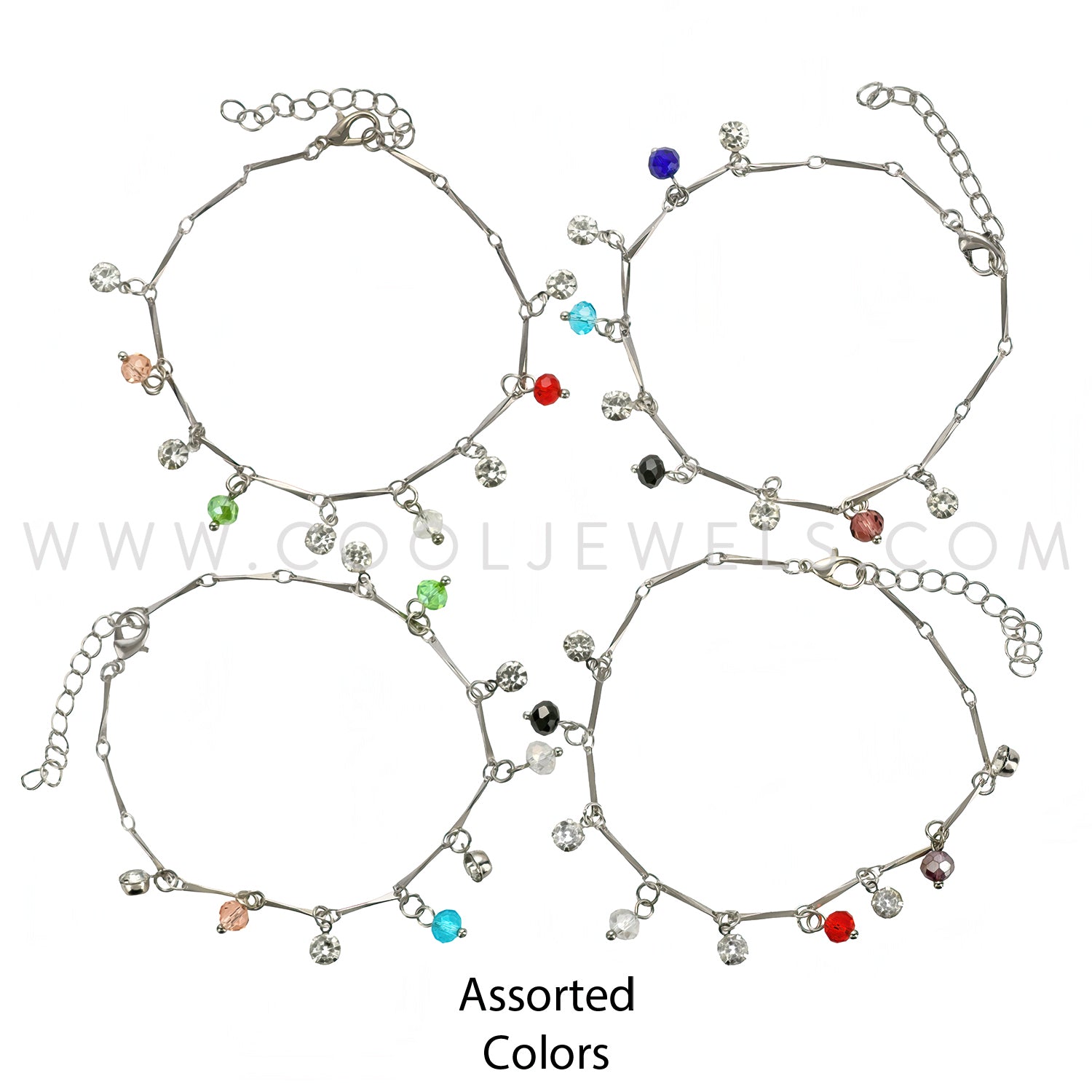 These Colored Rhinestones Silver Anklets feature a silver anklet with assorted colored beads and rhinestones.