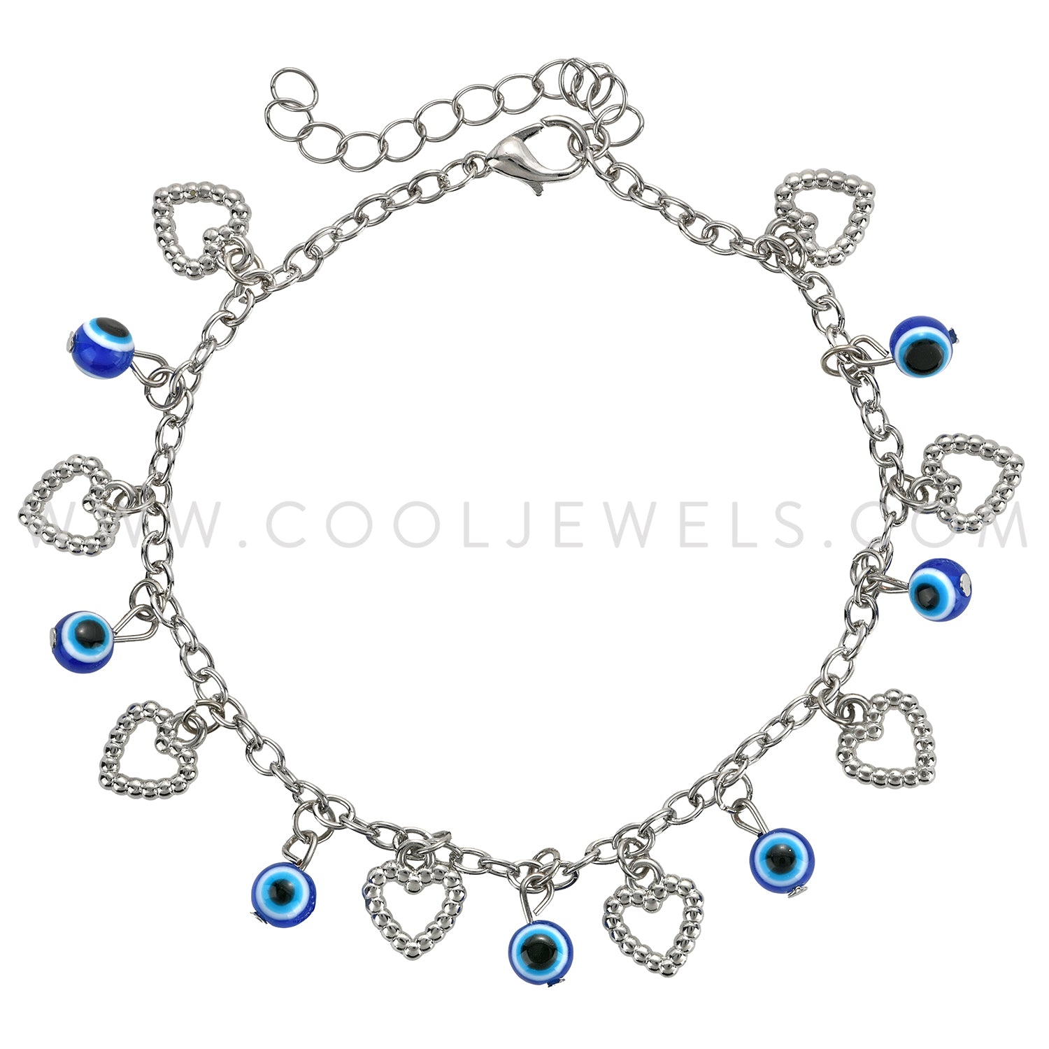 These Blue Eye Bead Heart Anklets feature multiple blue evil eye beads with silver heart charms.