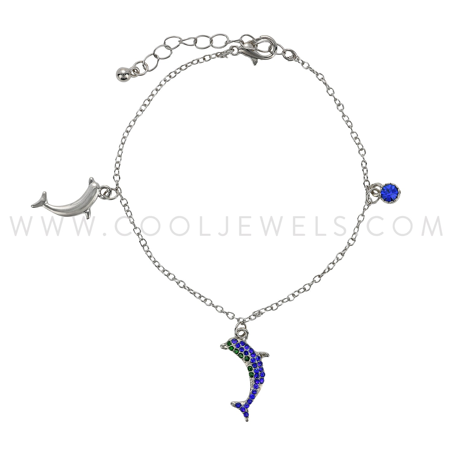 SILVER LINK CHAIN ANKLET WITH DOLPHIN PENDANTS & RHINESTONE BEAD