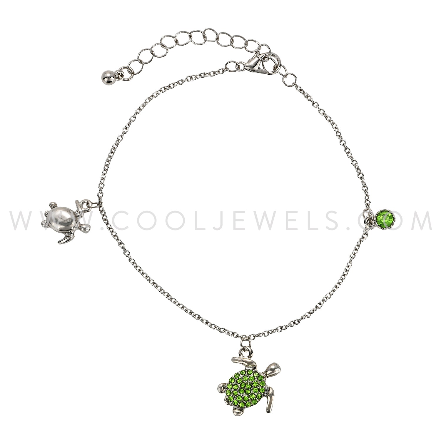 SILVER LINK CHAIN ANKLET WITH TURTLE PENDANTS & RHINESTONE BEAD