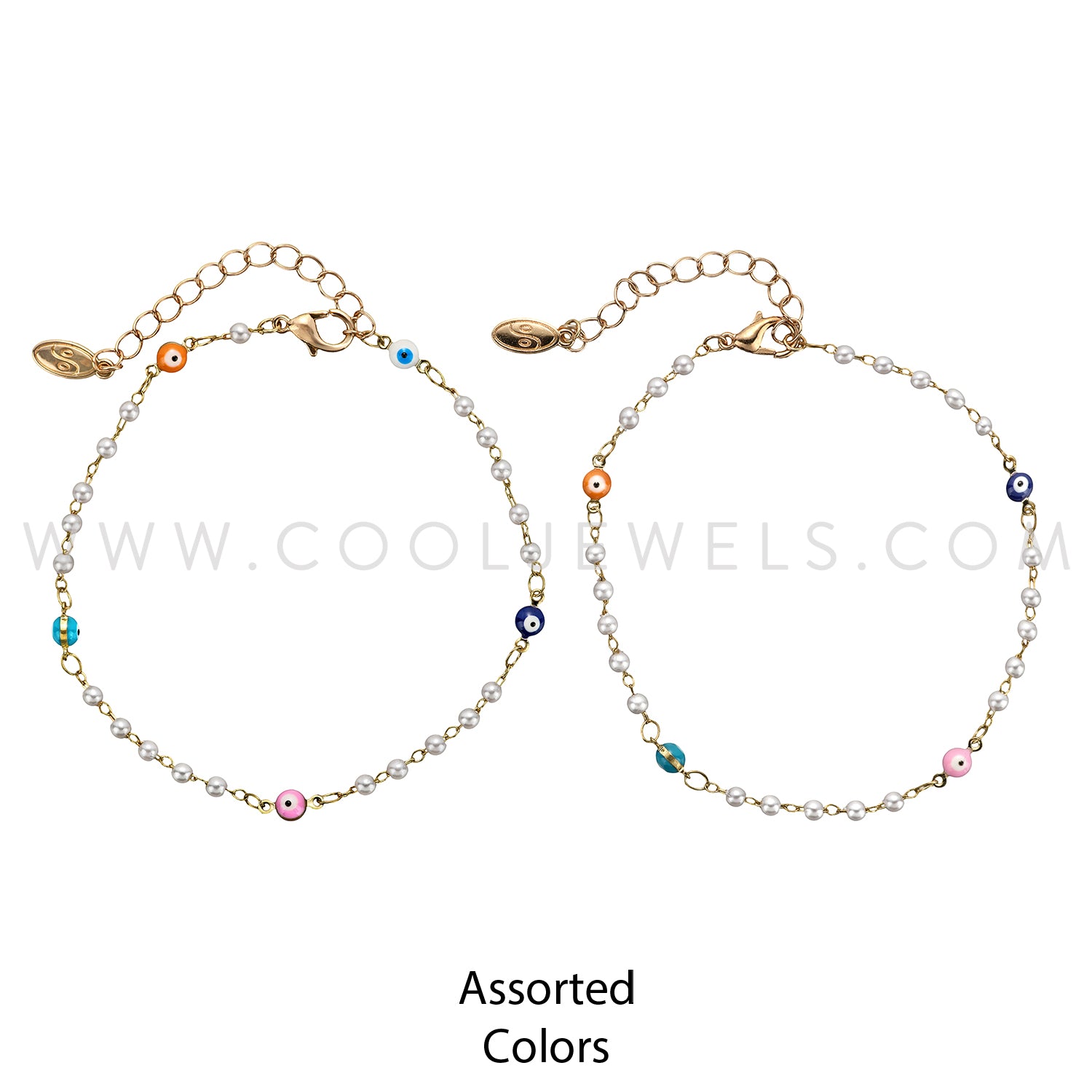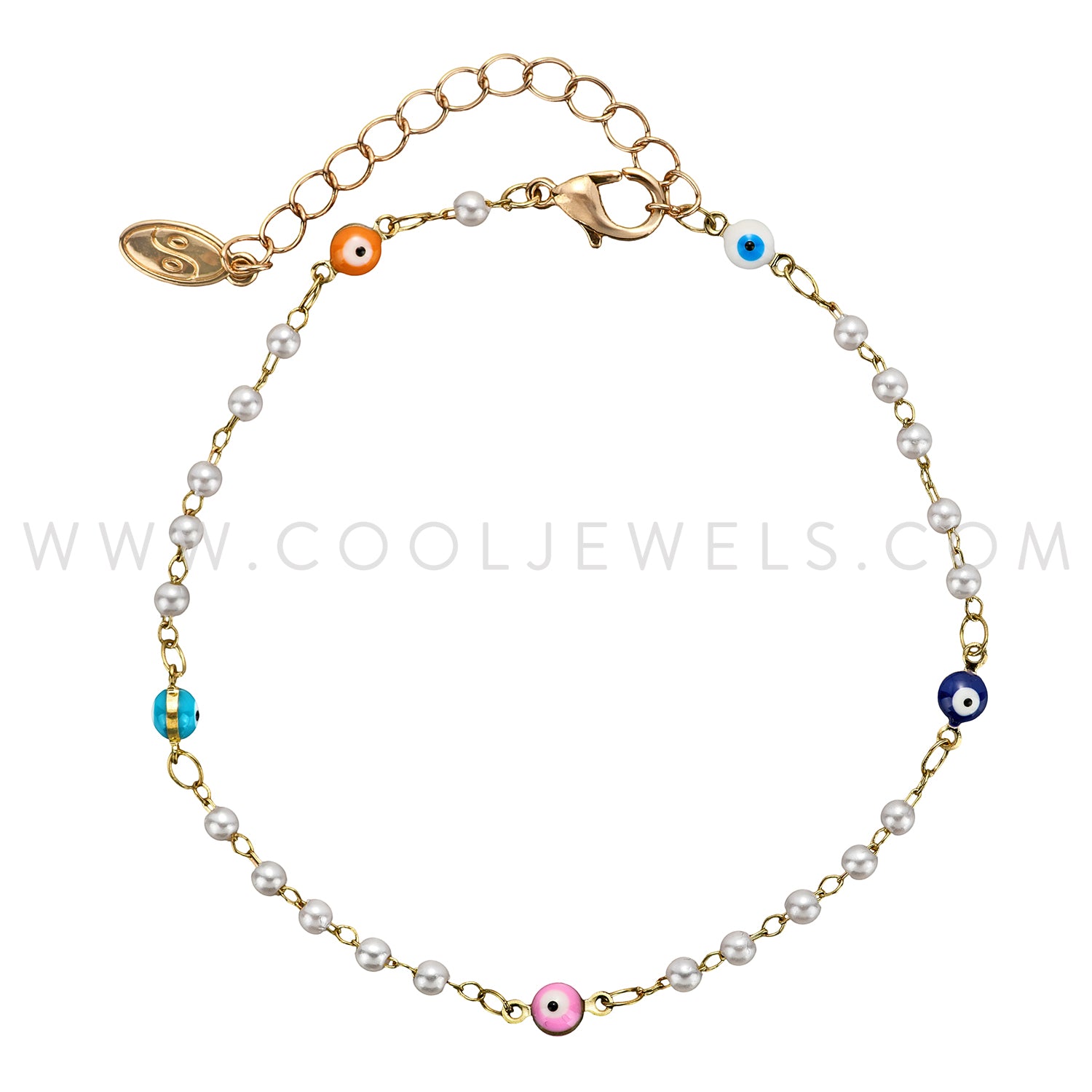 LINK CHAIN ANKLET WITH PEARL & EVIL EYE BEADS