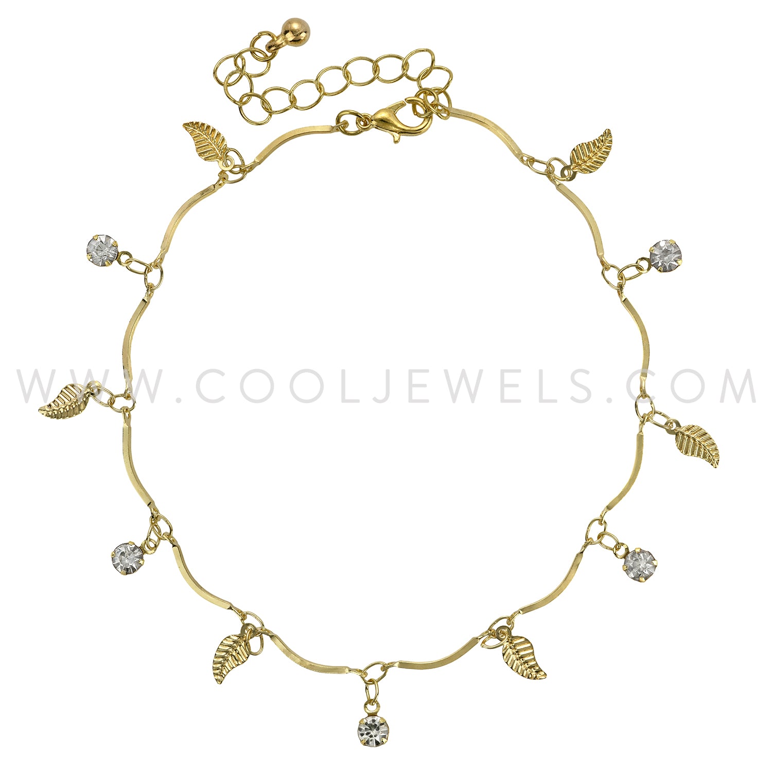 LINK CHAIN ANKLET WITH RHINESTONE DROPS AND LEAVES