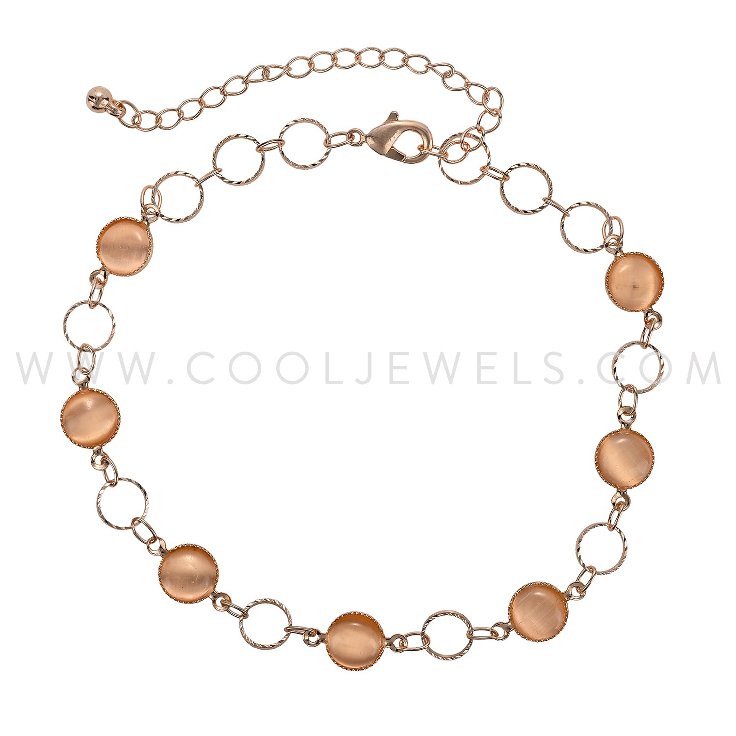 These Rose Gold Anklet with Colored Crystals features a rose gold chain anklet with rose-colored crystals.