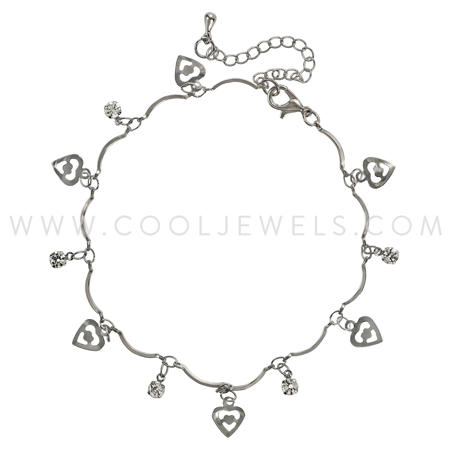 These Silver Hearts & Rhinestones Anklet features a silver bar links anklet with hearts and rhinestones.