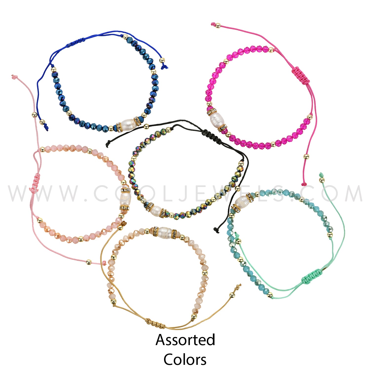 These Assorted Pearl & Colored Beads Slider Cord Anklet features a white pearl with colored beads with gold accents & rhinestones on a colored slider cord anklet.Each dozen comes with a variety of different colored anklets.
