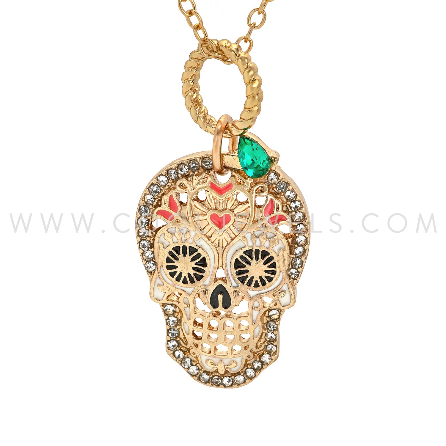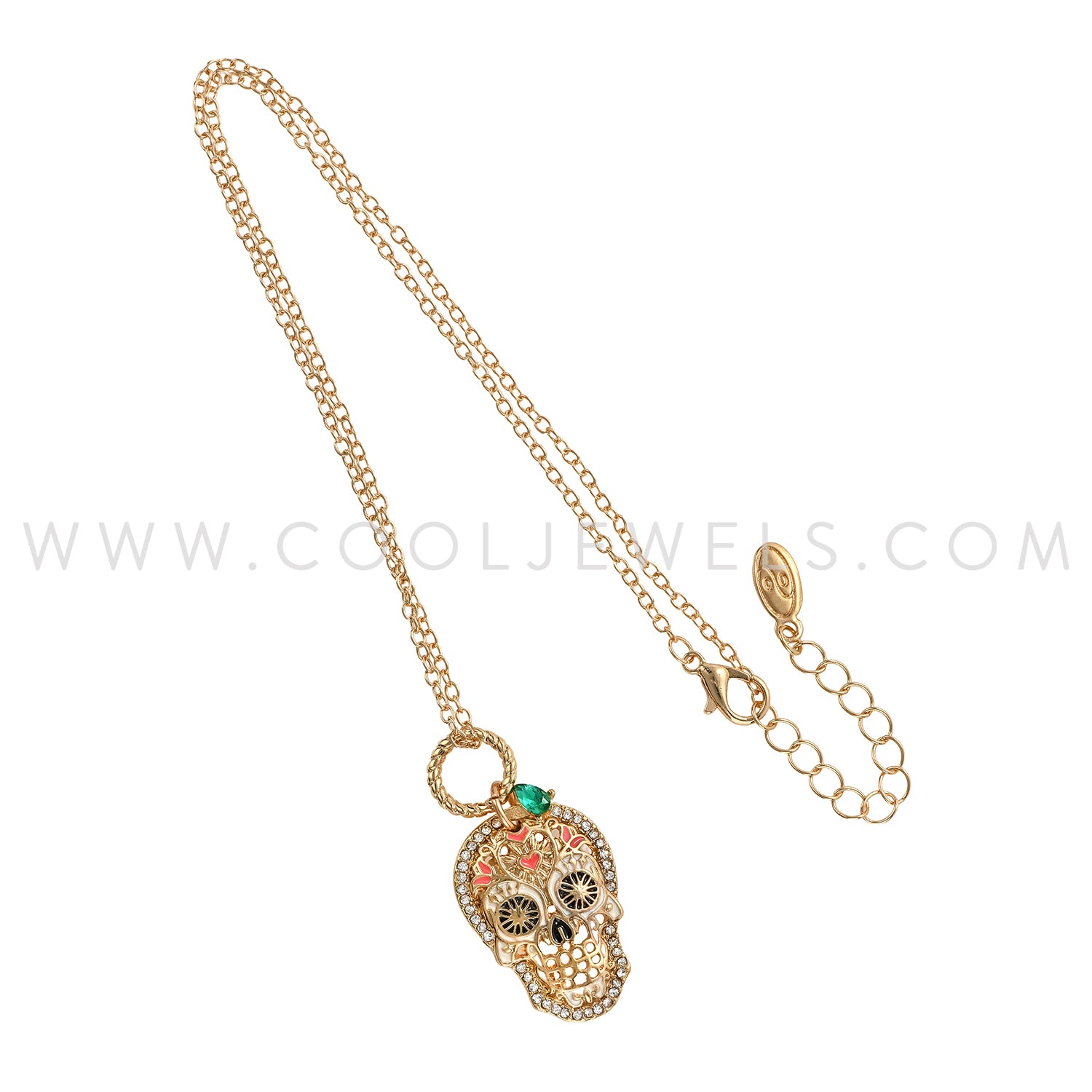 GOLD LINK CHAIN NECKLACE WITH RHINESTONE SUGAR SKULL PENDANT
