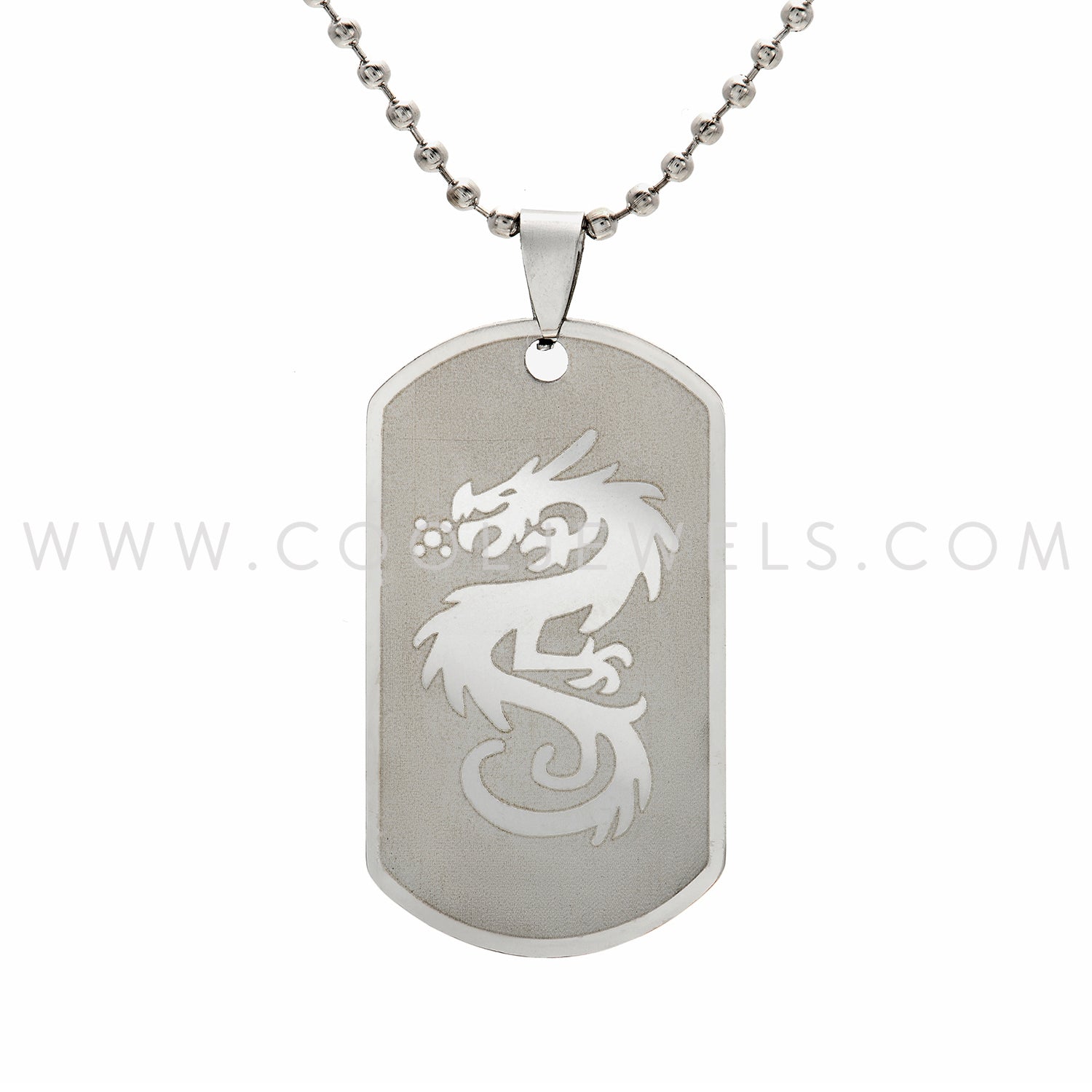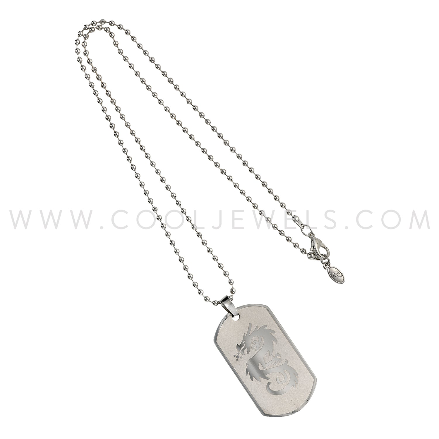 These Stainless Steel Dragon Dog Tag Necklaces feature a silver ball chain with a stainless steel dragon pattern on a dog tag shaped pendant.