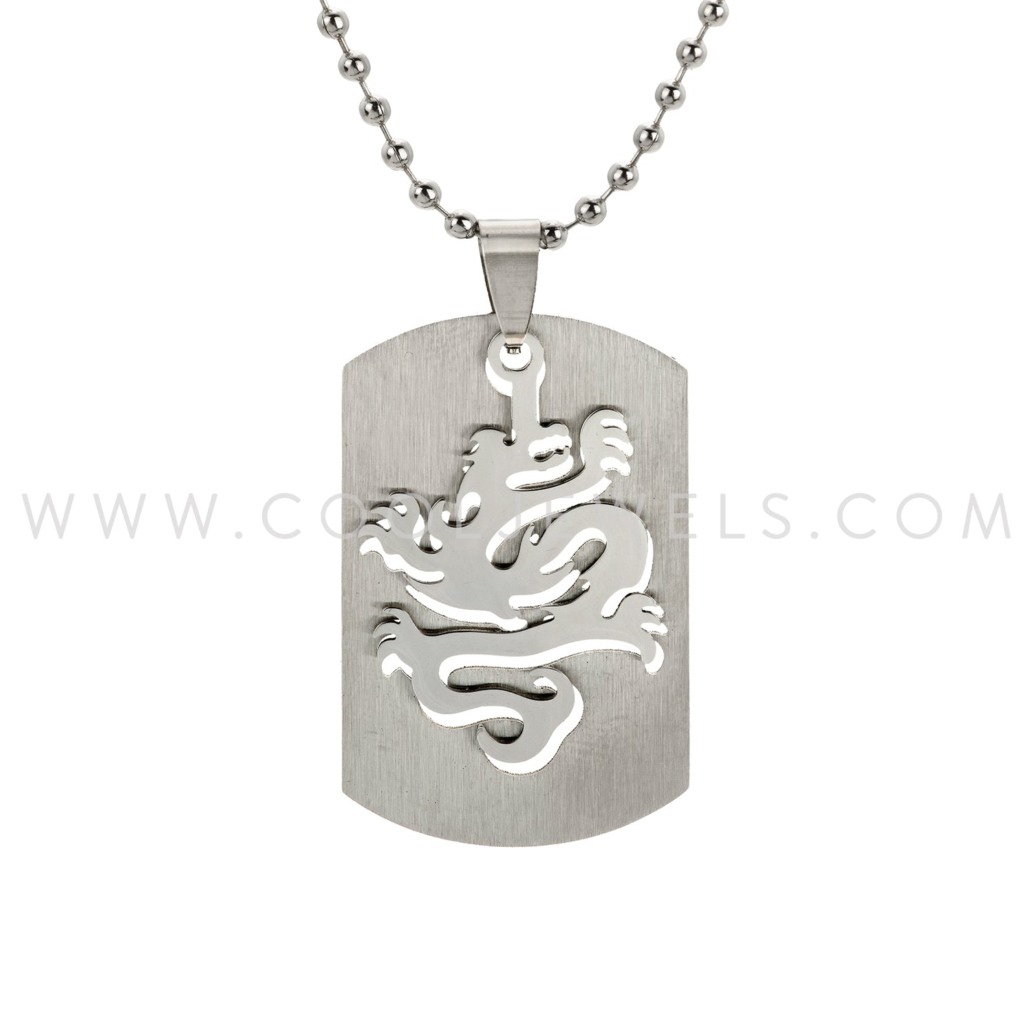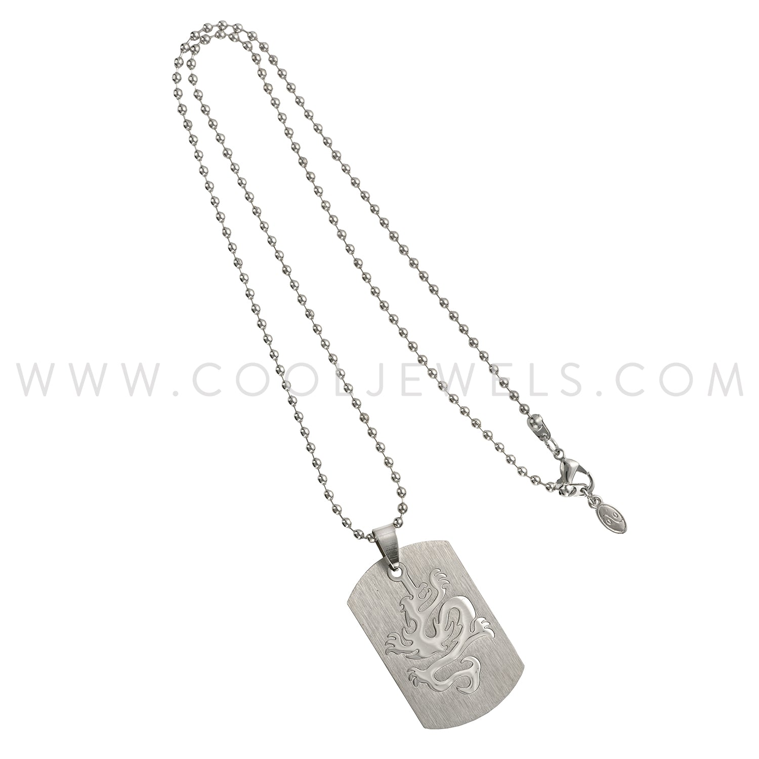 These Stainless Steel Dragon Dog Tag Necklaces feature a silver ball chain with a stainless steel dragon pattern cutout on a dog tag shaped pendant.