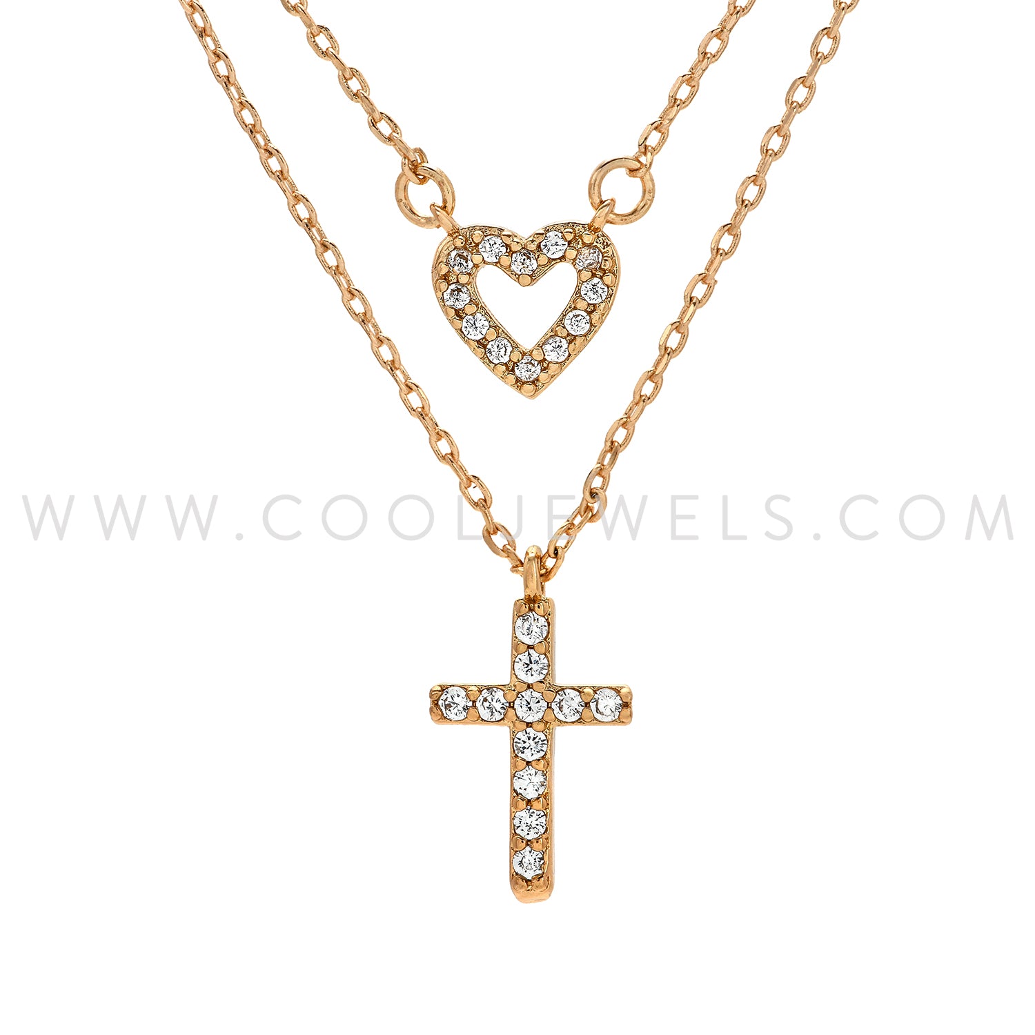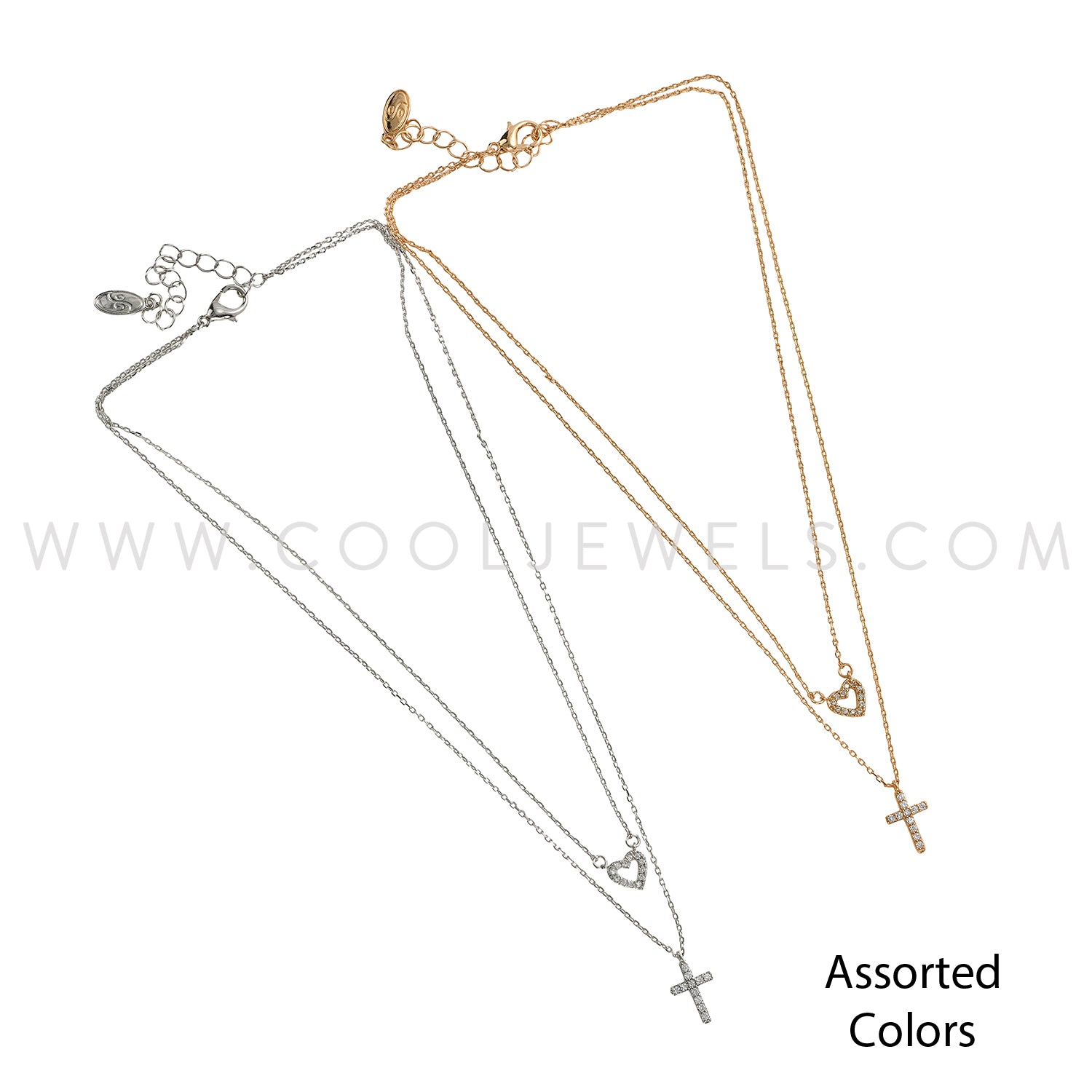 DOUBLE LAYER LINK CHAIN NECKLACE WITH RHINESTONE HEART & CROSS PENDANTS - ASSORTED
