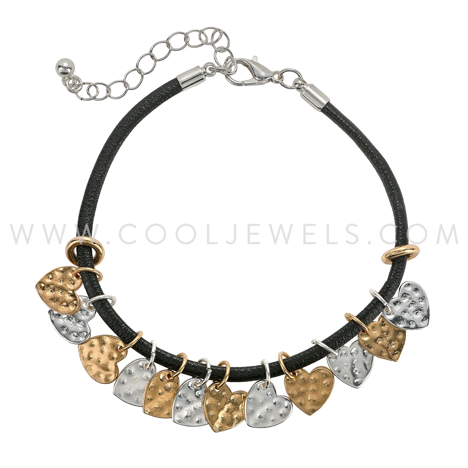BLACK WAX CORD BRACELETS WITH SILVER & GOLD HEART PENDANTS