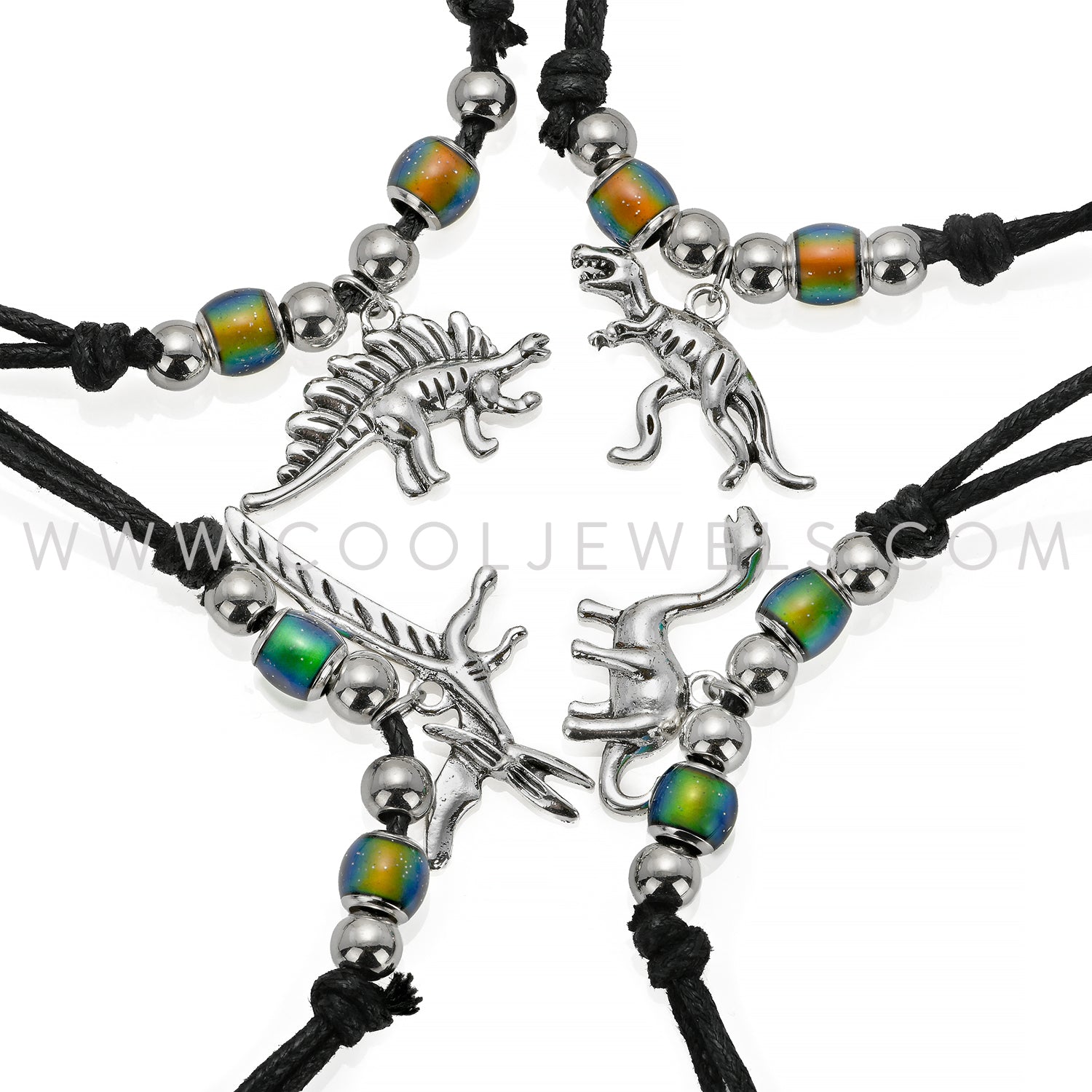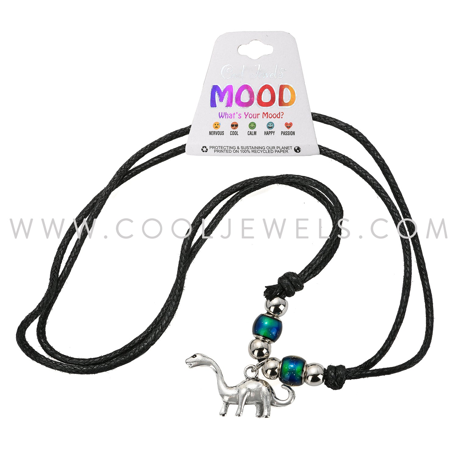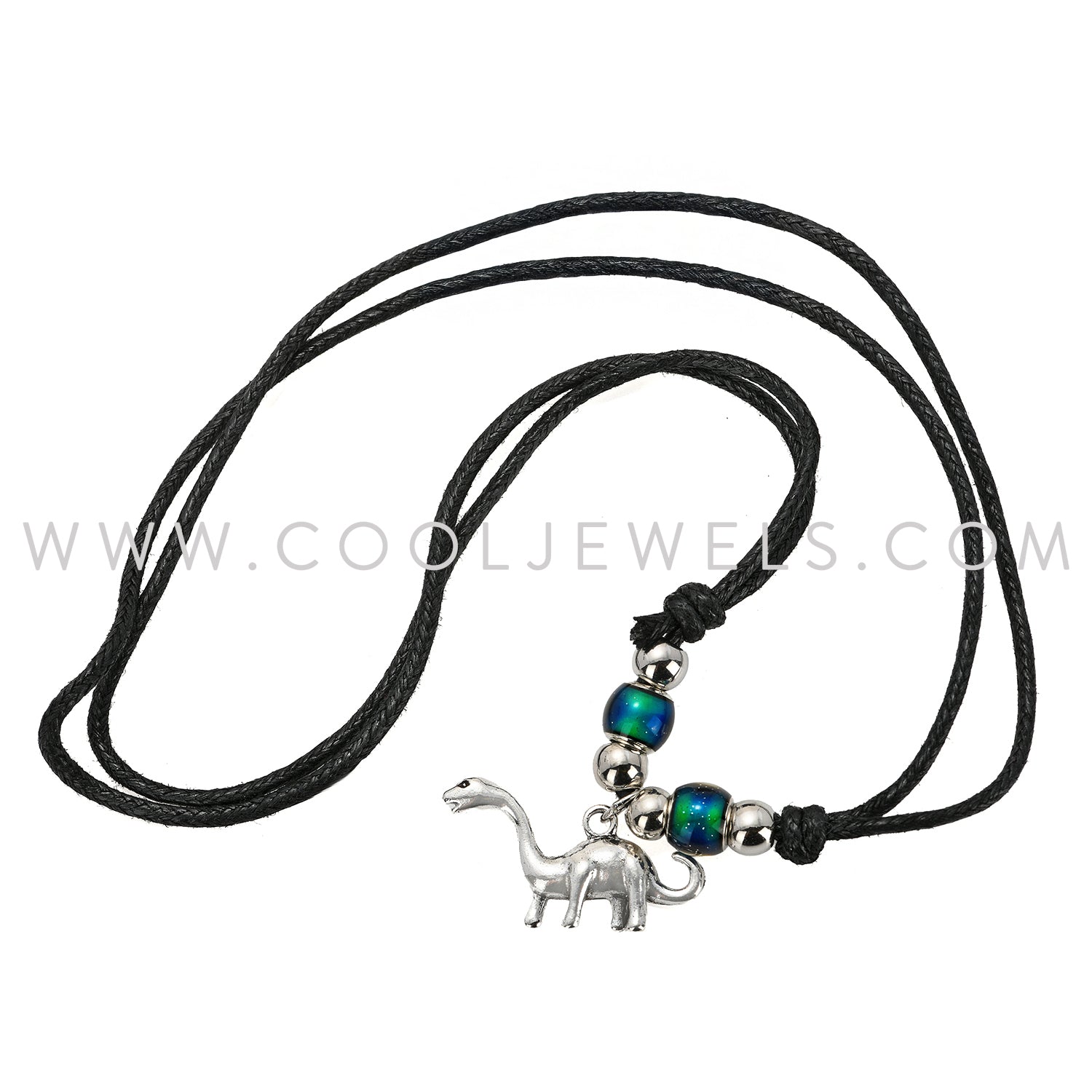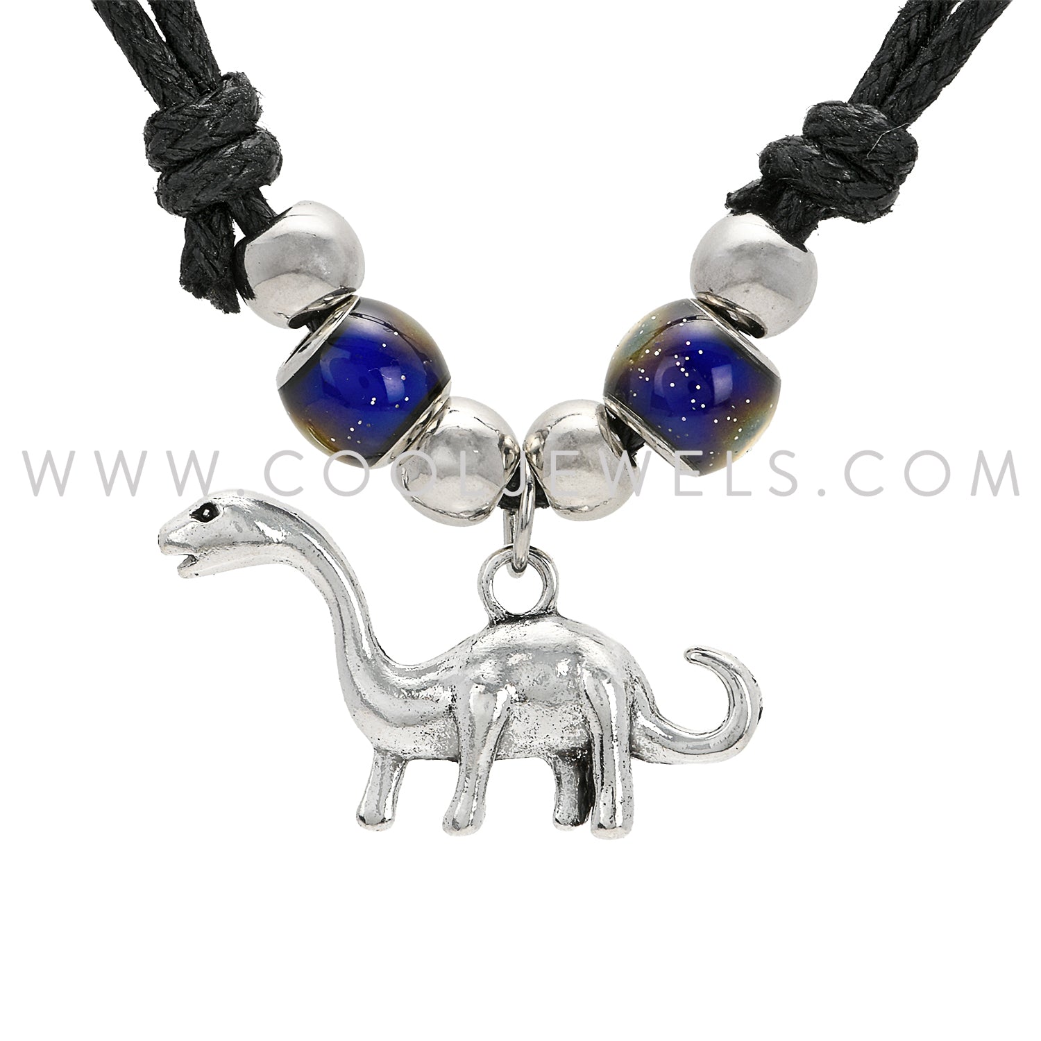 This Assorted Pewter Dinosaur Pendant comes on a 28" black slider cord with MOOD beads and silver beads on each side.