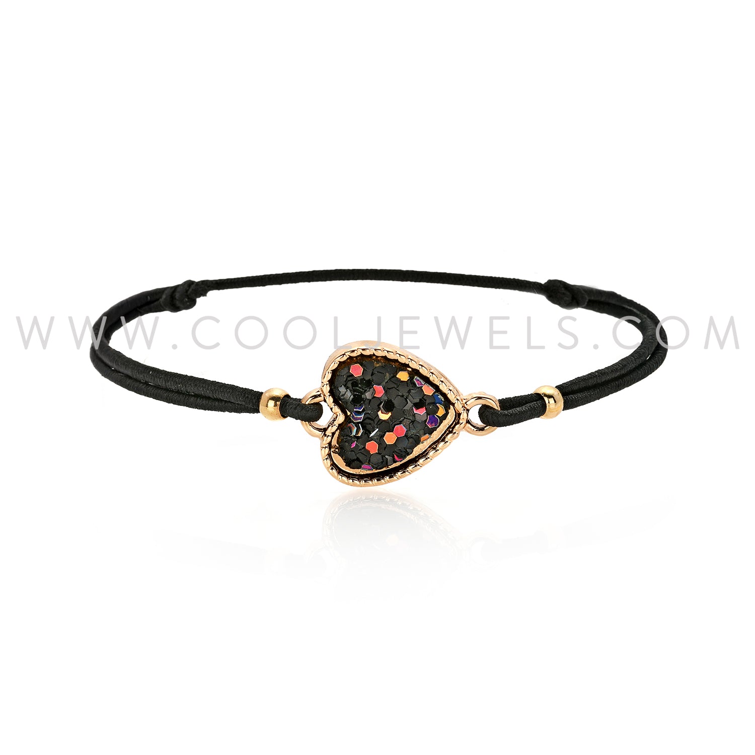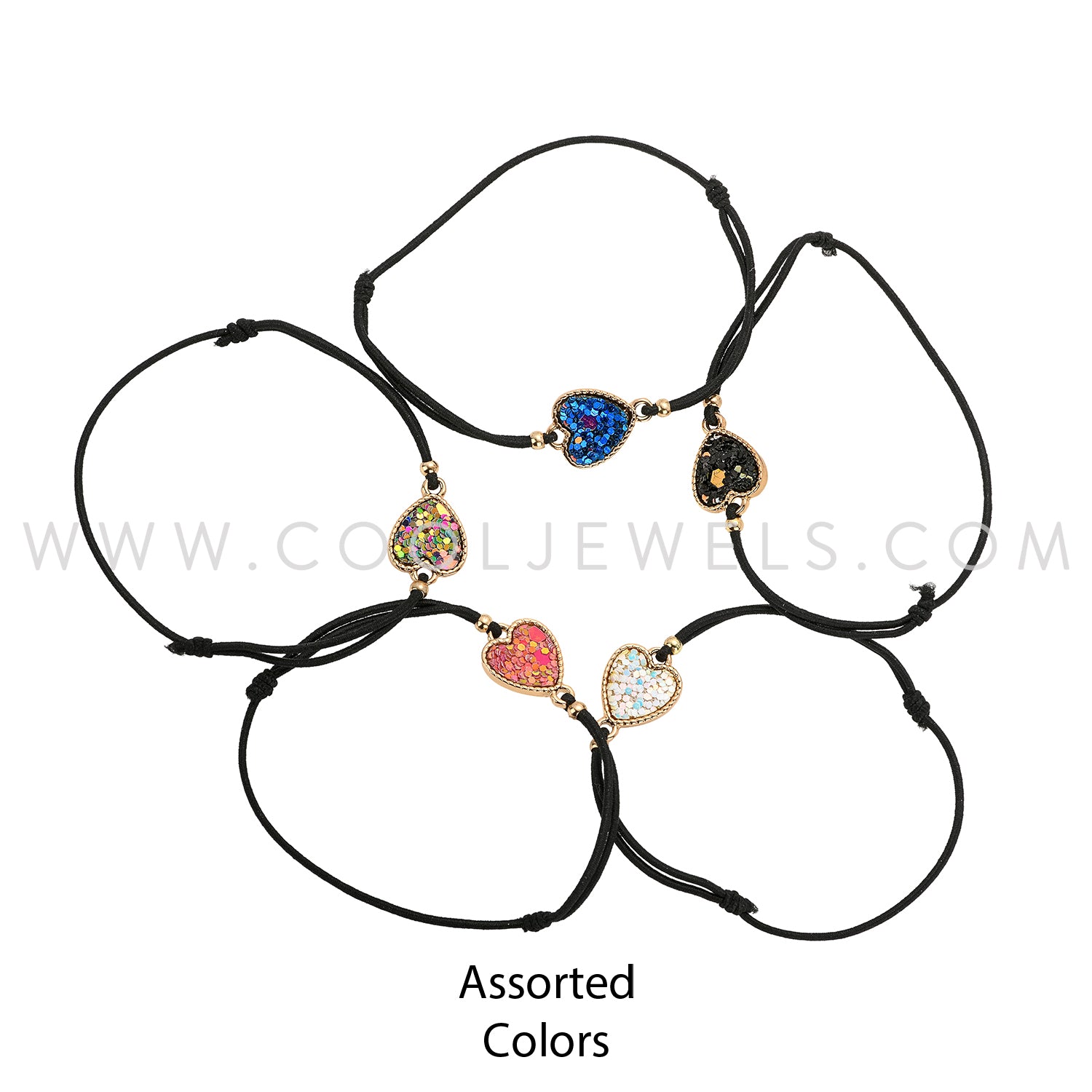 These Assorted White, Blue & Rainbow Cool Jewels® Elements by Candace Lauren® Glitter Heart Slider Bracelet features a colored glitter heart on a black slider cord bracelet for easy sizing.Fashion Bracelet comes in premium Elements packaging.