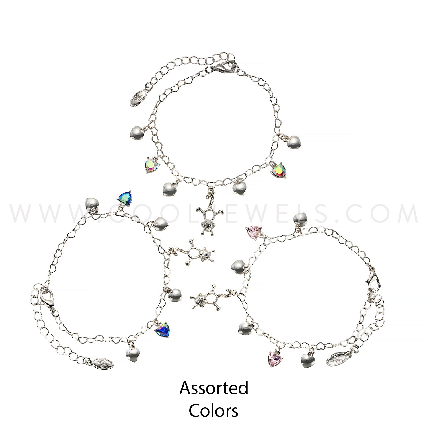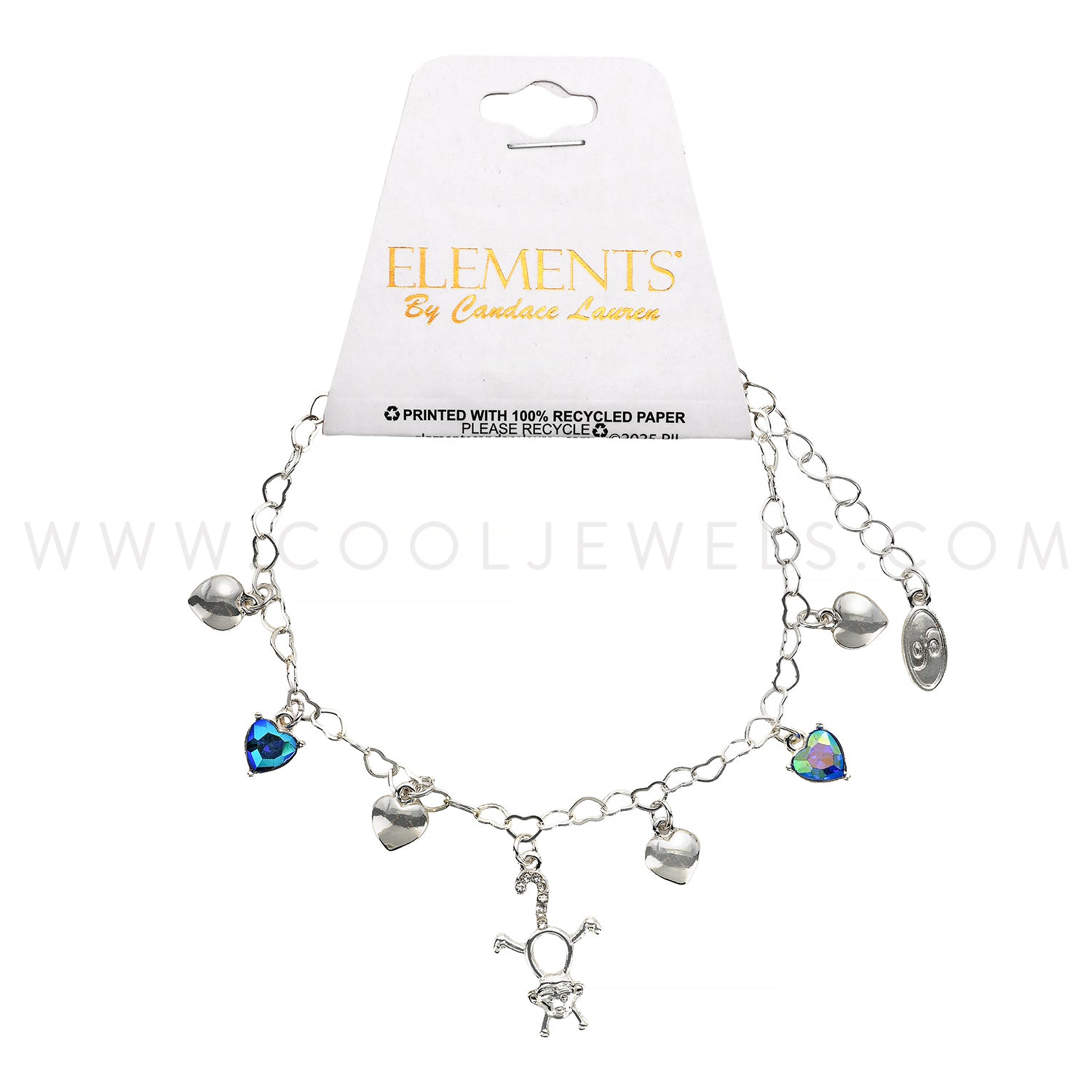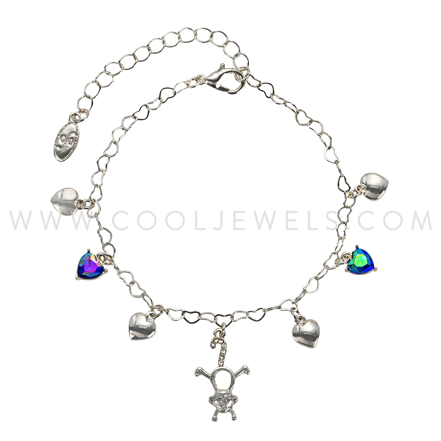 HEART CHAIN BRACELET WITH CRYSTAL CHARMS & MONKEY PENDANT ASSORTED - CARDED