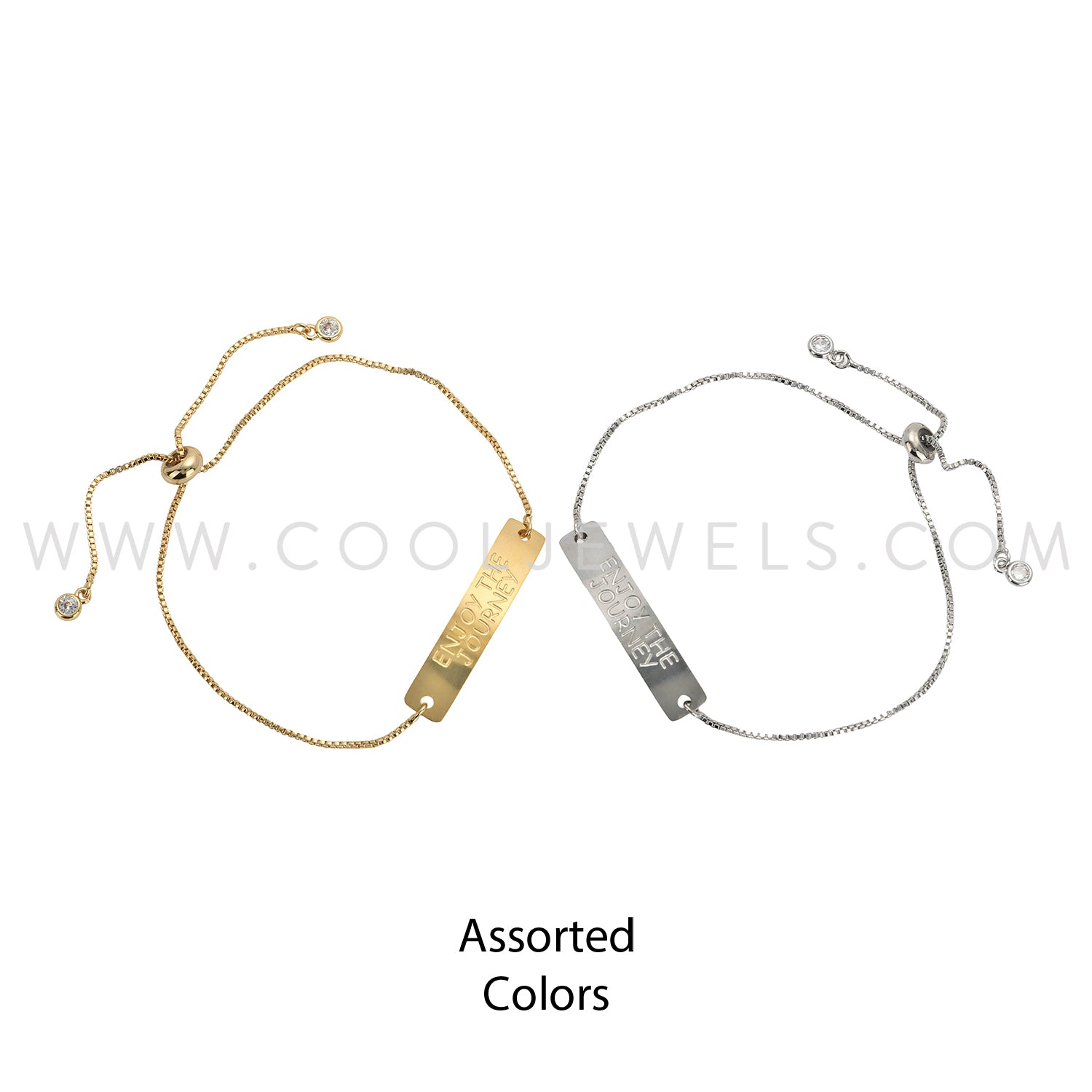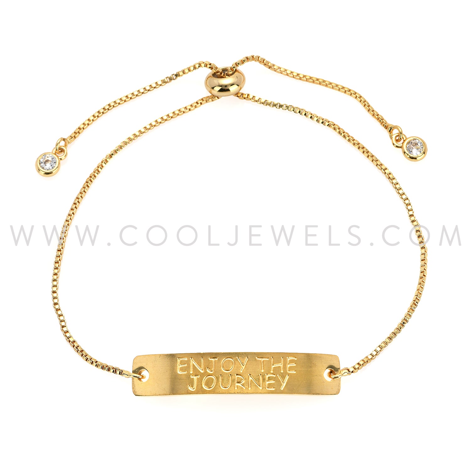 BOX CHAIN SLIDER BRACELET WITH TWO-SIDED ENGRAVED PLATE "ENJOY THE JOURNEY" - CARDED
