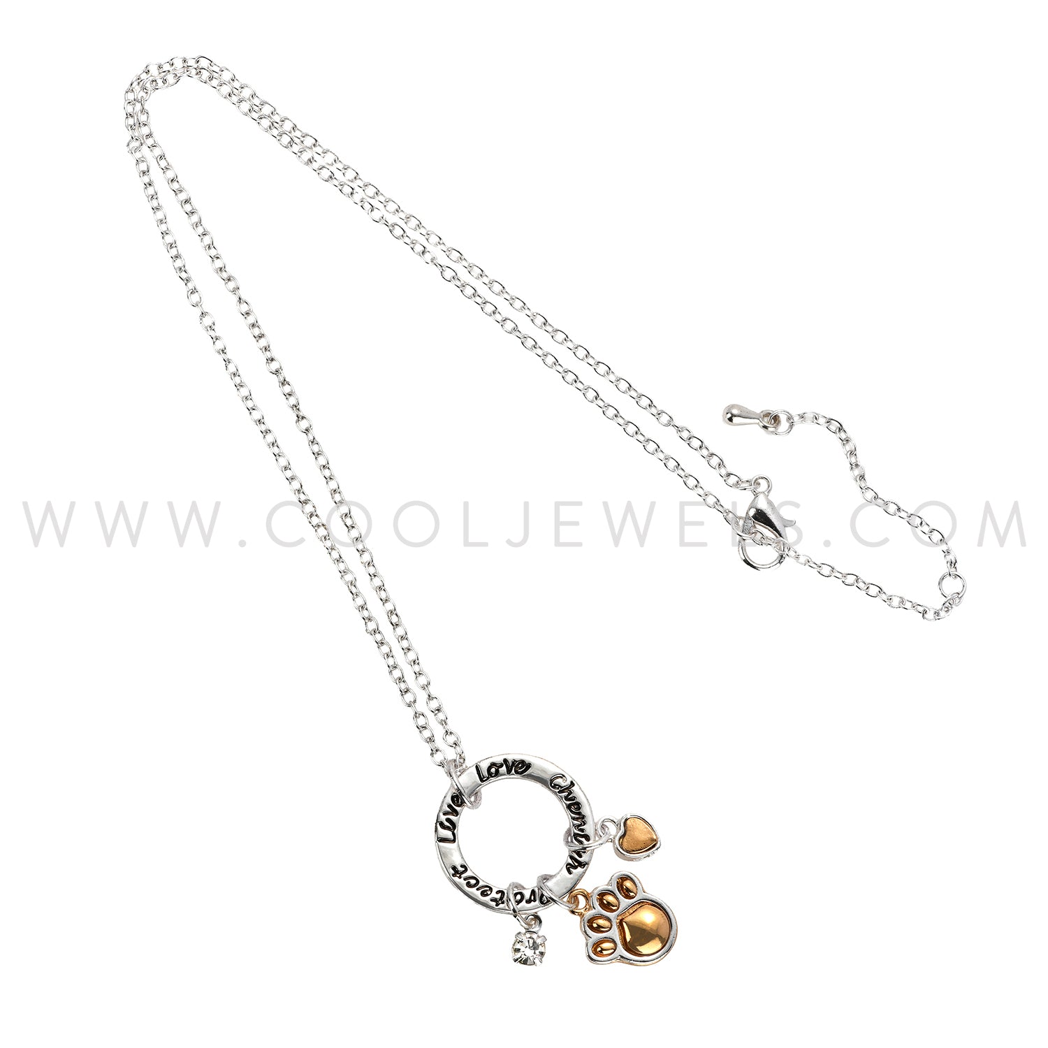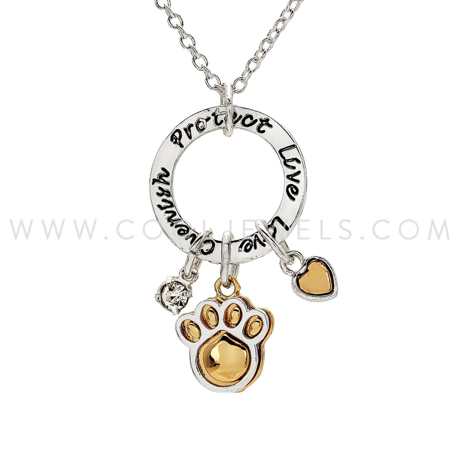 These Cool Jewels® Elements® by Candace Lauren® "Live, Love, Cherish, Protect" Charm Necklace features a petite "live, love, cherish, protect" silver round pendant with a gold heart, rhinestone, and gold paw pendants suspended on a rope chain link necklace.Petite 1/2" Inch Fashion Pendant comes in premium Elements packaging.