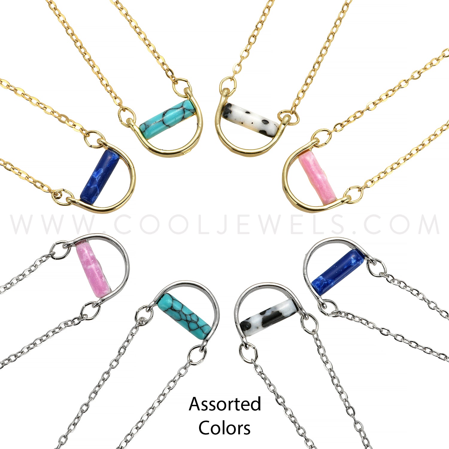 These petite Assorted Gold & Silver Cool Jewels® Elements by Candace Lauren® Stone Tube & U-Shape Pendant Necklace features a petite stone tube & U-shape pendant with multiple color options suspended on a chain link necklace. Stone comes in a variety of different colors.