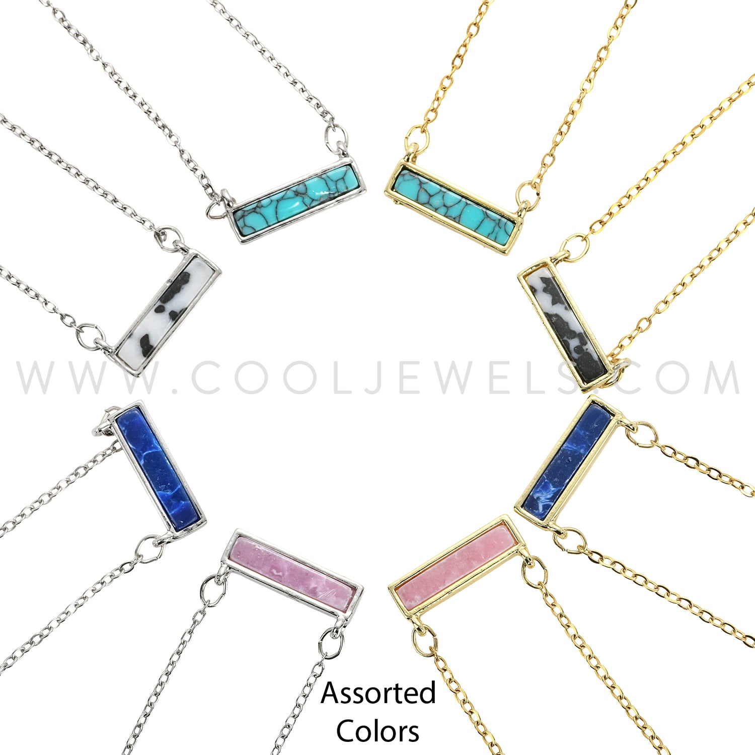 These petite Assorted Gold & Silver Cool Jewels® Elements by Candace Lauren® Stone Rectangular Pendant Necklace features a petite stone rectangular pendant with multiple color options suspended on a chain link necklace. Stone comes in a variety of different colors.Petite 1/2" Inch Fashion Pendant comes in premium Elements packaging.