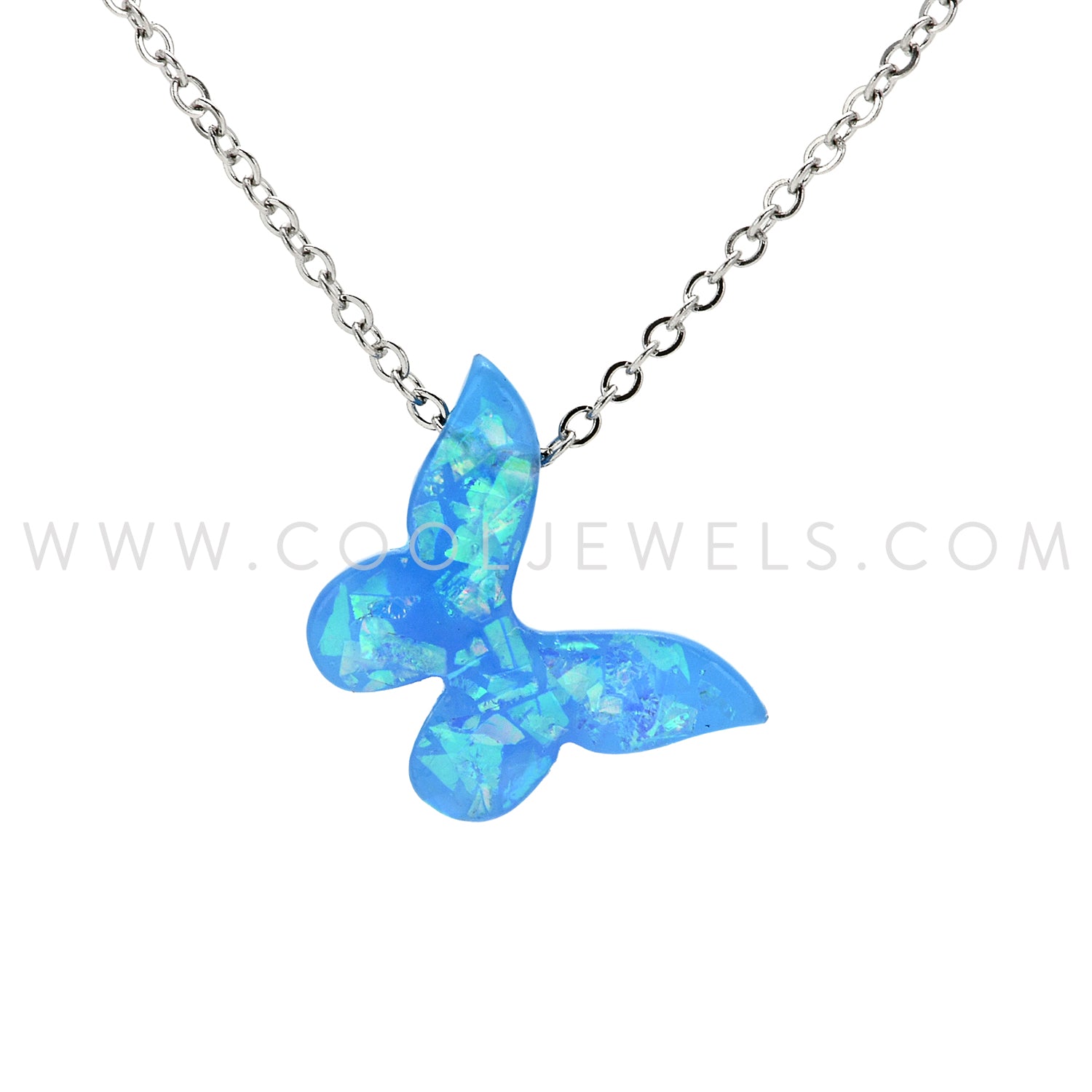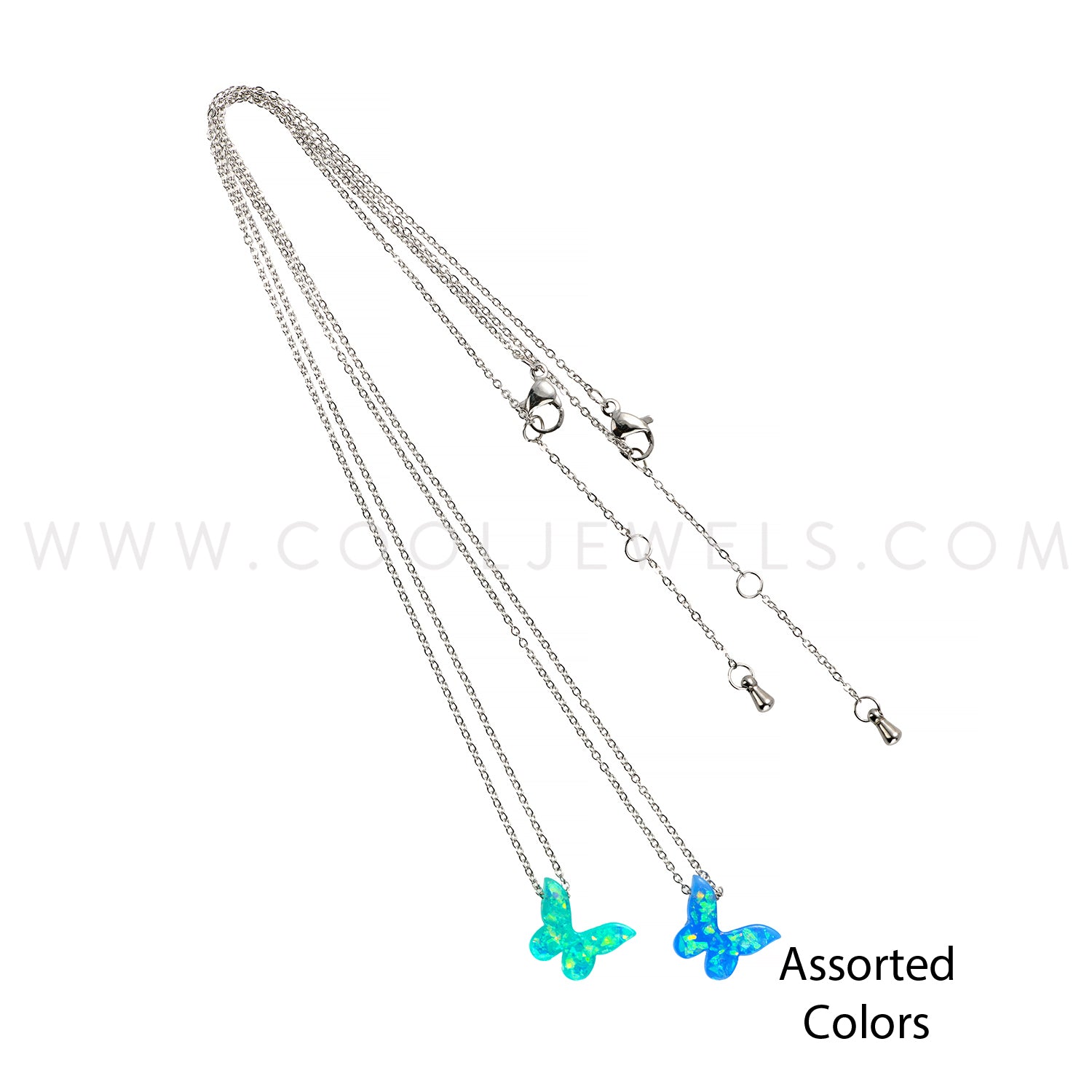 SILVER NECKLACE WITH IMITATION OPAL BUTTERFLY CARDED - ASSORTED COLORS